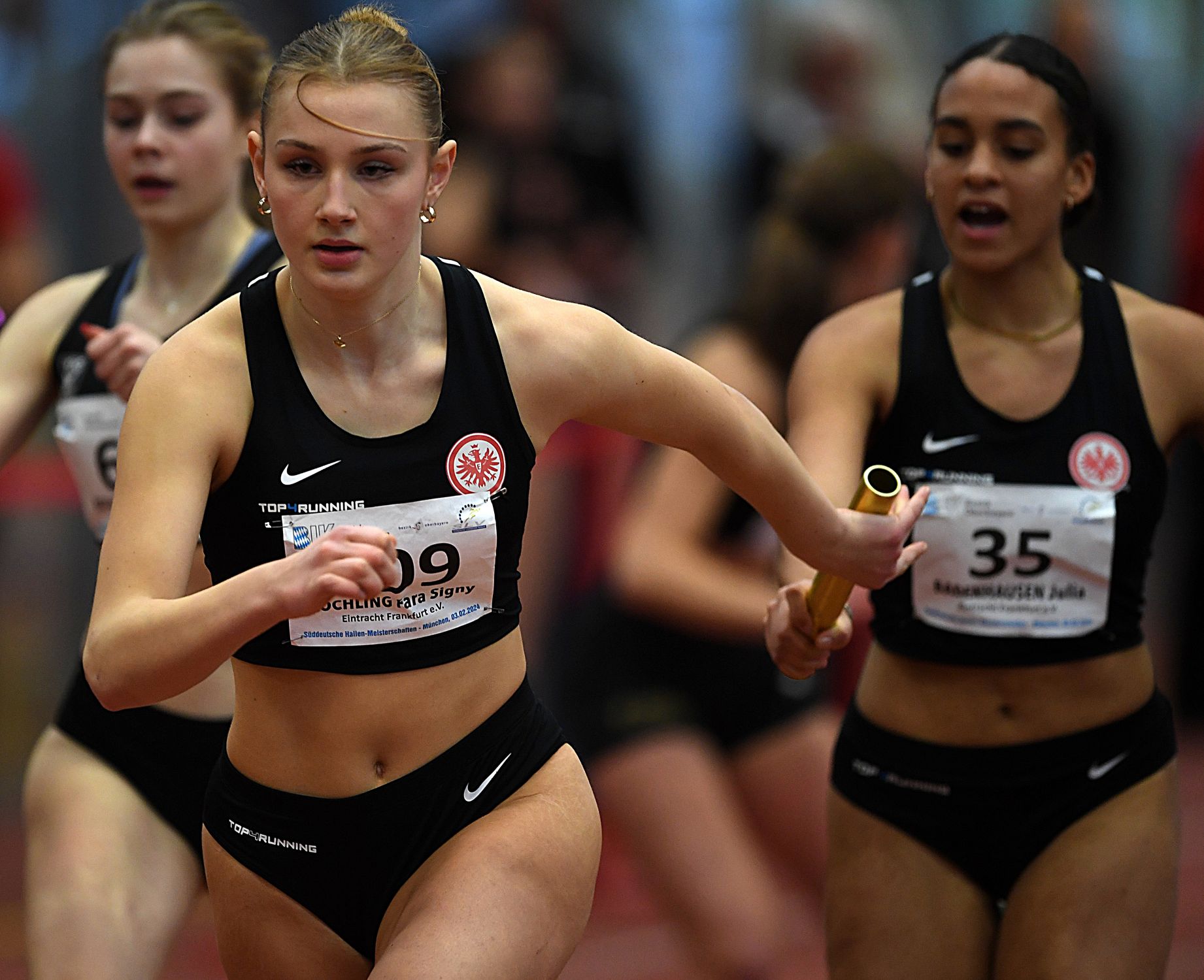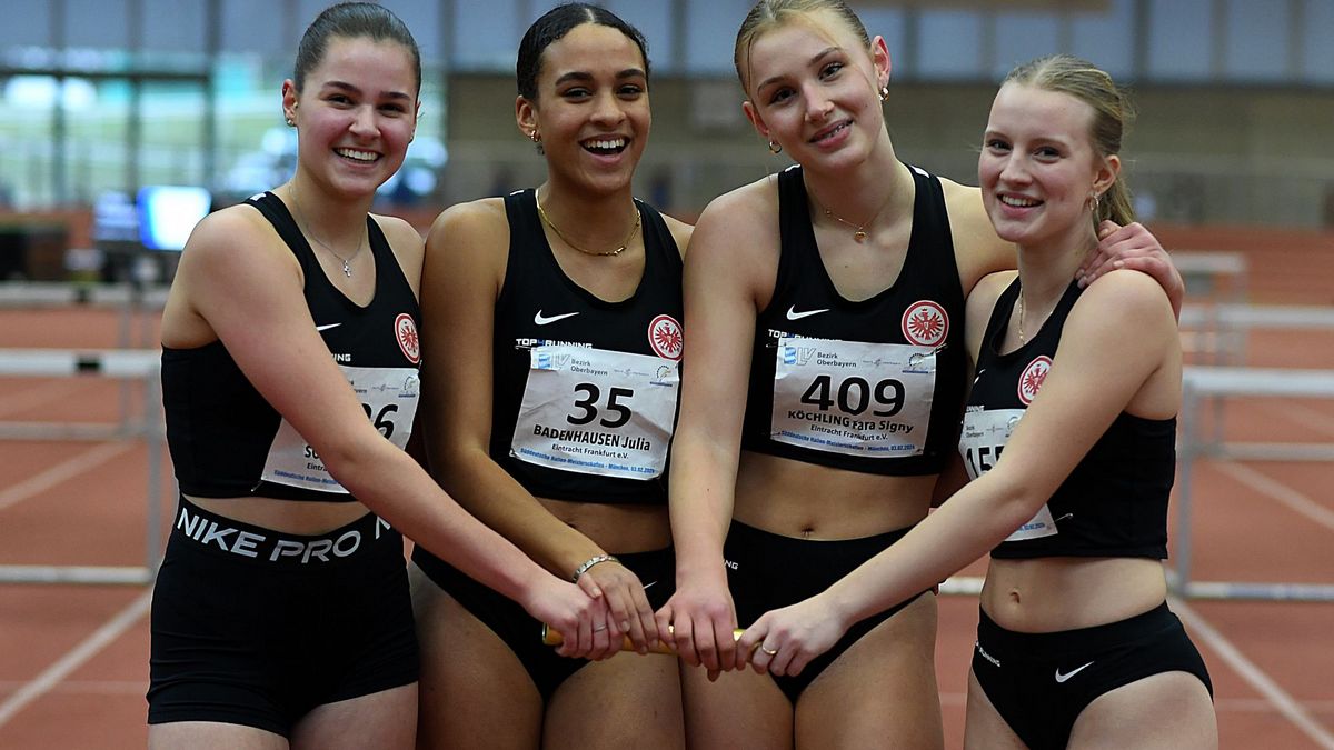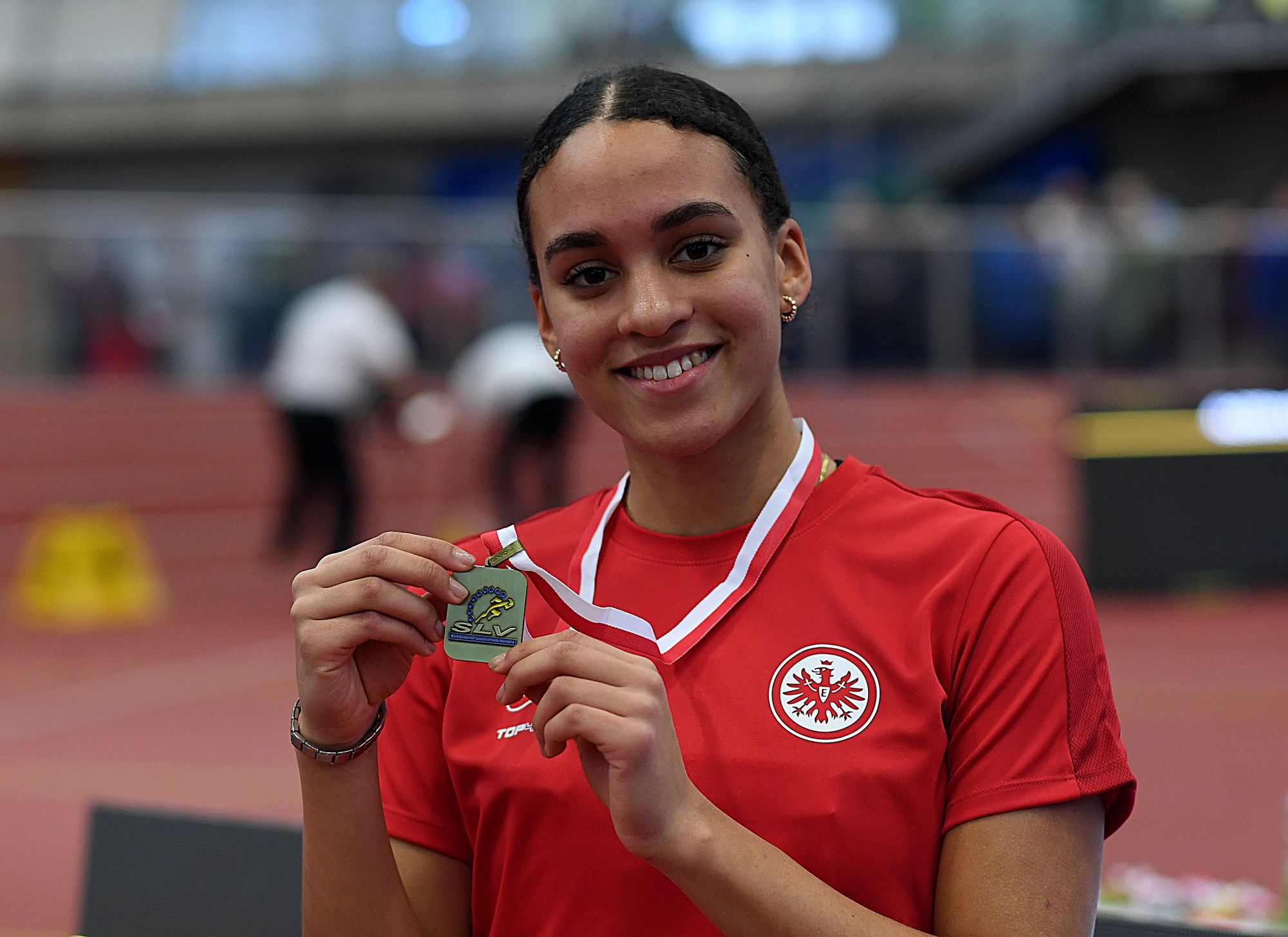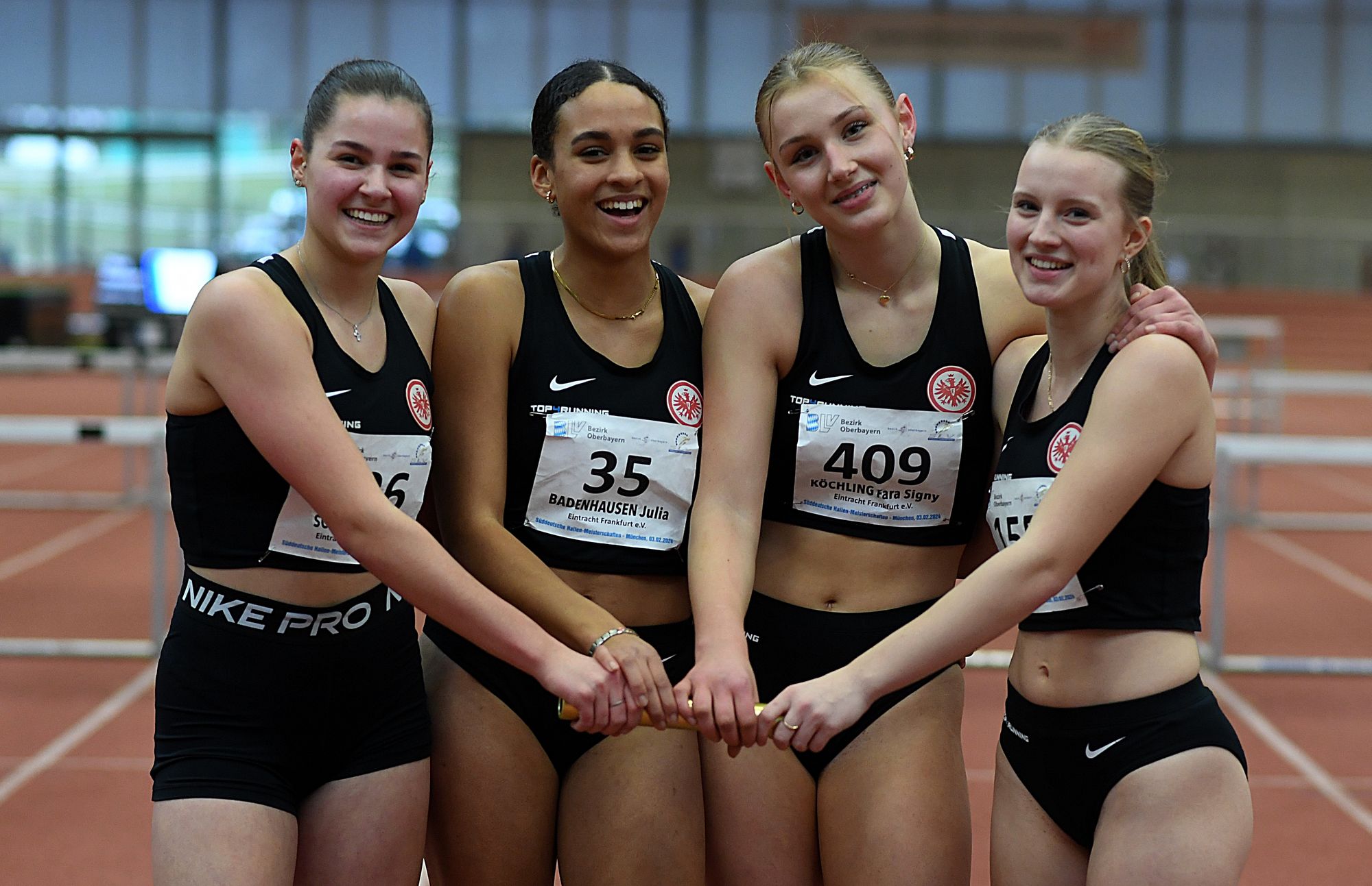 Nichts für schwache Nerven war das Finale über 60 Meter Hürden bei den Mädels. Nach Auswertung des Zielfotos trennten die beiden Spitzenkräfte nur 0,01 Sekunden. Louisa Grauel (TV Gelnhausen) hatte mit der neuen Bestzeit von 8,63 Sekunden dann das bessere Ende für sich. Fara Signy Köchling (Eintracht Frankfurt/8,64 sec.) konnte sich neben „Silber“ aber ebenfalls über eine neue Bestmarke freuen. Lotta Egbers (Eint. Ffm./8,92 sec) wurde Vierte. Ihr fehlten nur 0,11 Sekunden für den kompletten hessischen Triumph. Den begehrten SDM-Titel gab es für die beiden SGE-Athletinnen dann mit der Staffel ihres Vereins über 4x200 Meter. Die Adler-Trägerinnen setzten sich in der Besetzung Sonja Schwab, Julia Badenhausen, Fara Signy Köchling und Lotta Egbers in 1:42,76 Sekunden ganz souverän mit fast zwei Sekunden Vorsprung (Welten im Sprint) gegen die Startgemeinschaft „Mainz/Bingen“ (1:44,50 sec.) durch. Auch Emmanuella Adusei trägt das Eintracht Trikot und durfte nach 7,78 Sekunden im Sprintfinale auf die dritte Stufe des Siegertreppchens steigen. Auch für Amelie Tortell (LG OVAG Friedberg-Fauerbach) gab es die Bronzemedaille. Die zierliche Mittelstrecklerin wurde über 800 Meter mit 2:14,52 Minuten gestoppt. „So schnell war ich noch nie unterwegs. Das ist eine neue Bestzeit, über die ich mich riesig freue. Zum Schluß sind mir die Beine ganz schön schwer geworden, aber zum Glück hat es gereicht“, verriet die kleine Schwester von 3000-Meter-Meister Marc Tortell, der hinter der Bande stand und Amelie kräftig anfeuerte. Im Hochsprung meisterte Nina Stöhr (Amicitia Viernheim) als Achte mit 1,61 Metern eine neue Bestmarke. Grund zum Strahlen hatte Julia Badenhausen (Eintracht Frankfurt), die beim Weitsprung nach 5,55 Meter wieder Bodenkontakt hatte und sich mit dieser neuen Bestmarke den dritten Platz sicherte. Auf dem ungeliebten vierten Platz (5,47 m) beendete Anabel Gajic (SV Fun-Ball Dortelweil) diese Konkurrenz. Zudem beförderte Anabel die Kugel als Siebte auf die neue Bestmarke von 12,47 Metern. Komplettiert wurde das hessische Medaillen-Festival in der bayerischen Landeshauptstadt durch den Bronze-Rang (11,41 m) im Dreisprung von Josephina Engel (ASC Darmstadt).