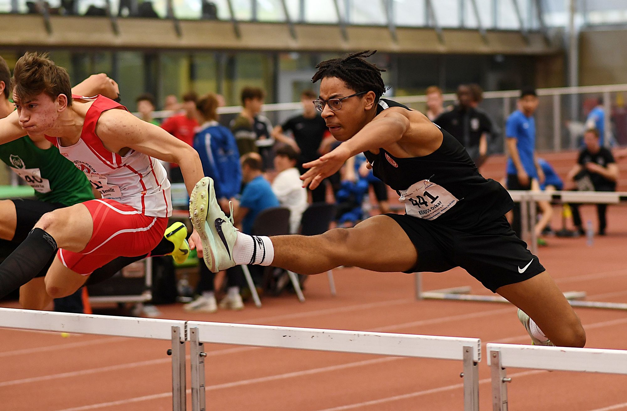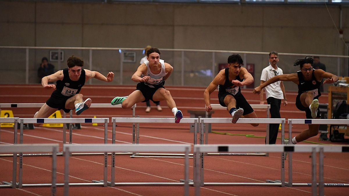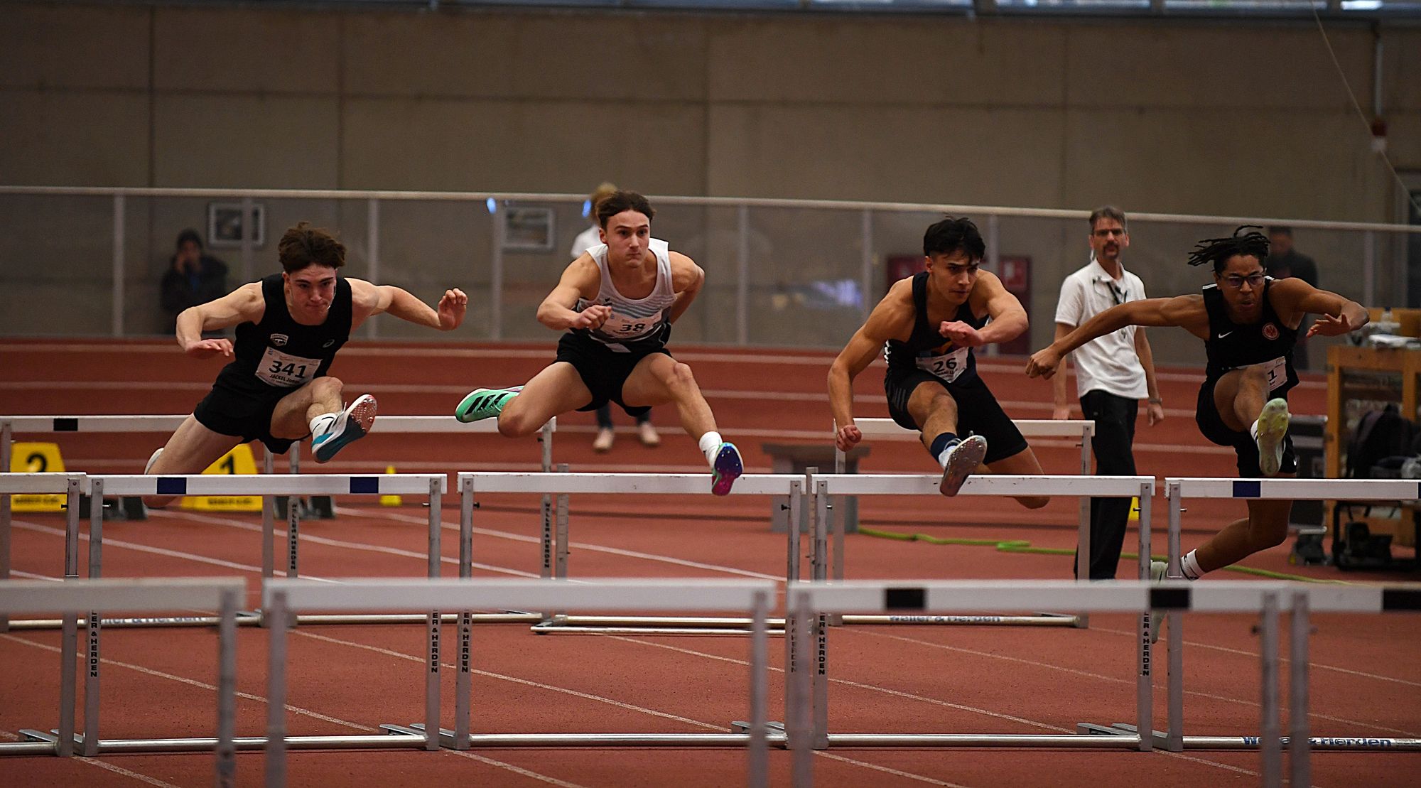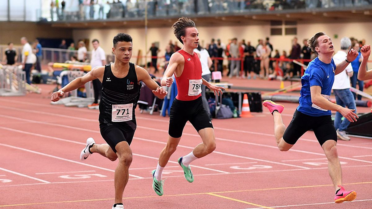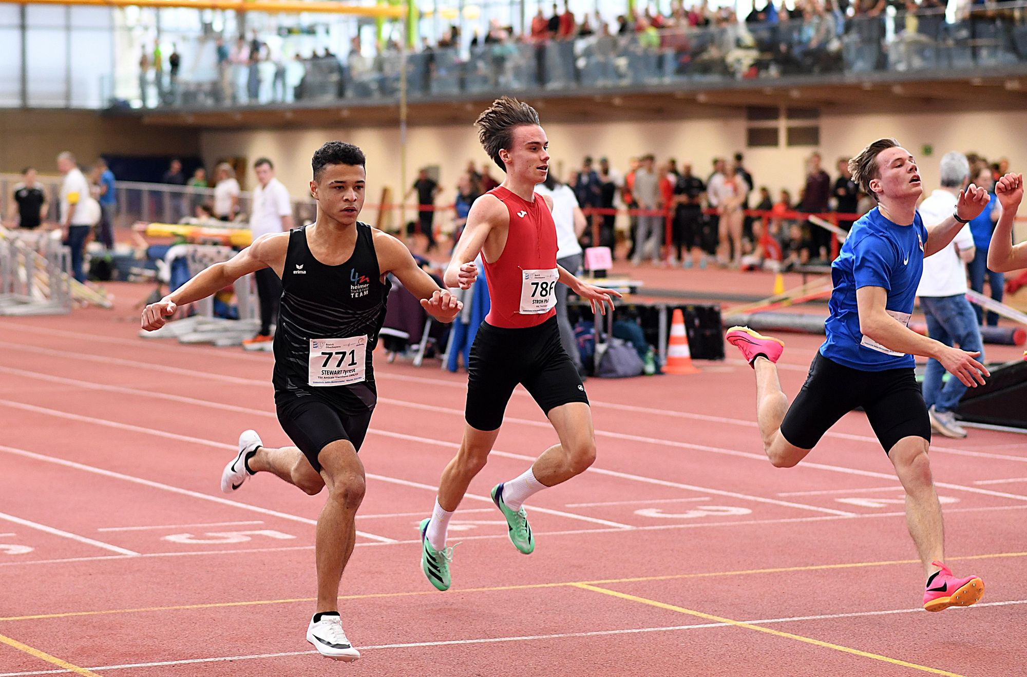 Ein beeindruckendes Bild bot sich im 60-Meter-Finale, waren hier doch sechs der acht Bahnen mit schnellen Jungs aus Hessen besetzt. Und es sollte noch besser kommen, denn es gelang ein astreines „Triple“. Angeführt wurde das pfeilschnelle Trio von Tyrese Stewart (Amicitia Viernheim), der sich mit 7,07 Sekunden hauchdünn gegen Niklas Becker (SG Egelsbach/7,08 sec.) durchsetzte. Das Podium komplettierte Ruben Heinzel (LG Odenwald/7,10 sec.). Die übrigen Finalisten waren Philip Stroh (ASC Darmstadt/4. mit 7,15 sec.), Aleksander Illmer (Wiesbadener LV/5. in 7,18 sec.) sowie Darian Ave (Hünfelder/7. nach 7,23 sec.).