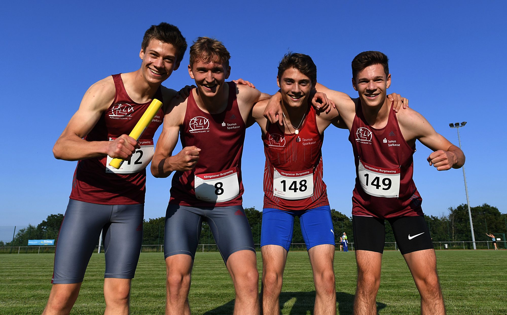 Überragend der Auftritt der Startgemeinschaft „Königsteiner LV - TV Groß-Gerau - MTV Kronberg“ über 4x100 Meter, die in der Besetzung Maurice Andrew, Aaron Amenta (beide TV Groß-Gerau), Finn Kohlenbach und Schlussläufer Julian Rubel (KLV) ein ganz großes Staffel-Rennen zeigten, obwohl sie in dieser Konstellation erstmals unterwegs waren. Mit phantastischen 42,10 Sekunden stellen sie in der Altersklasse U18 den Hessenrekord (bisher nur Wiesbadener LV) ein und sind mit ihrer Top-Zeit aktuell die Nummer eins in Deutschland, klar vor der Startgemeinschaft Team Erfurter LAC (42,50 sec.).