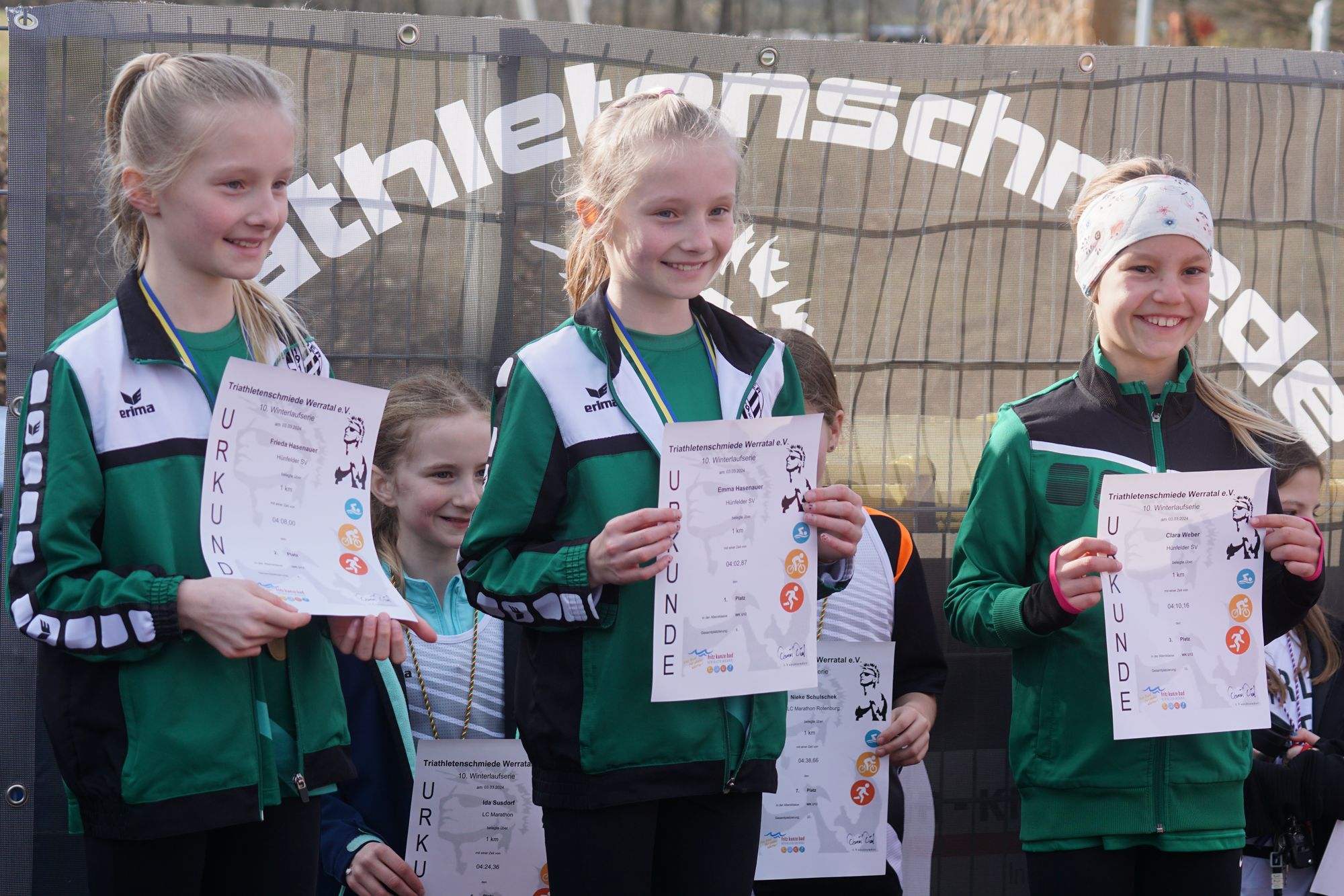Mit dabei vom Hünfelder SV auf der 1-Kilometer-Strecke waren hier sage und schreibe 14 Läuferinnen und Läufer. Und die Bilanz kann sich wahrlich sehen lassen. Bei den Jungs wurden Platz „1“ und „3“ in der Gesamtwertung geholt; bei den Mädels gingen gar alle Podestplätze der Gesamtwertung an unsere Athleten. In der männlichen Gesamtwertung holte Lennart Schmitt (M12) in 3:36,06 Minuten und in der weiblichen Gesamtwertung holte Joelina Cean in 3:36,62 Minuten jeweils den Gesamtsieg. In den Altersklassen U10, U12 und U14 g ab es von jeweils 6 maximal möglichen Platzierungen „5“ erste, „3 zweite und „3“ dritte Plätze. Und schaut man sich dann die gelaufenen Zeiten näher an, dann stimmt einen das schon froh.