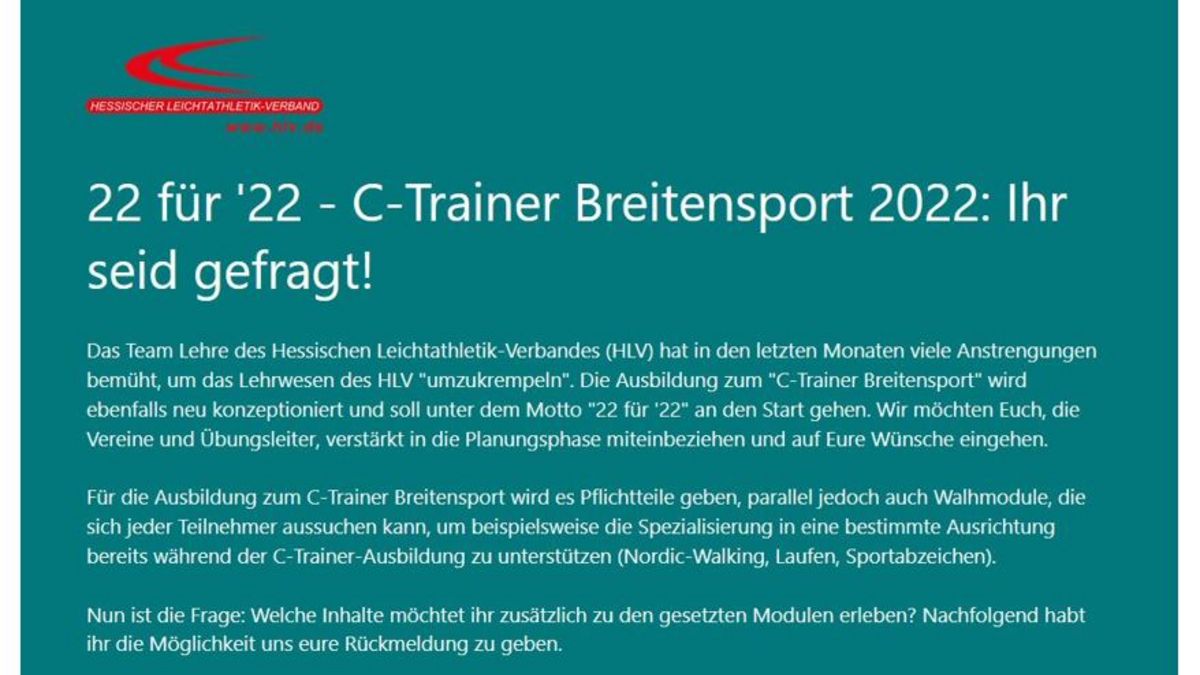 Das Team Lehre des HLV hat in den letzten Monaten viele Anstrengungen bemüht, um das Lehrwesen "umzukrempeln". Die Ausbildung zum "C-Trainer Breitensport" wird ebenfalls neu konzeptioniert und soll unter dem Motto "22für22" an den Start gehen. Wir möchten dabei auf die Wünsche der Vereinsmitglieder eingehen und deren Bedarf in die Planungsphase mit einbeziehen.