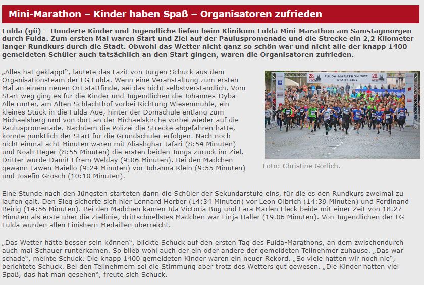 Hunderte Kinder und Jugendliche liefen beim Klinikum Fulda Mini-Marathon am heutigen Samstagmorgen durch Fulda. Zum ersten Mal waren Start und Ziel auf der Pauluspromenade und die Strecke ein 2,2 Kilometer langer Rundkurs durch die Stadt. Obwohl das Wetter nicht ganz so schön war und nicht alle der knapp 1400 gemeldeten Schüler auch tatsächlich an den Start gingen, waren die Organisatoren zufrieden.