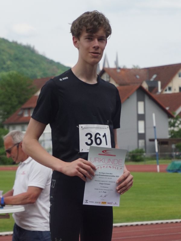 Die gleichen Medaillenfarben gingen auch an Gregor Schubert (TV Windecken). Er holte mit gleich im 1. Versuch übersprungenen 1,62 Metern im Hochsprung der männlichen Jugend U18 den Sieg und belegte im Weitsprung mit 5,63 Metern den 3. Platz.
