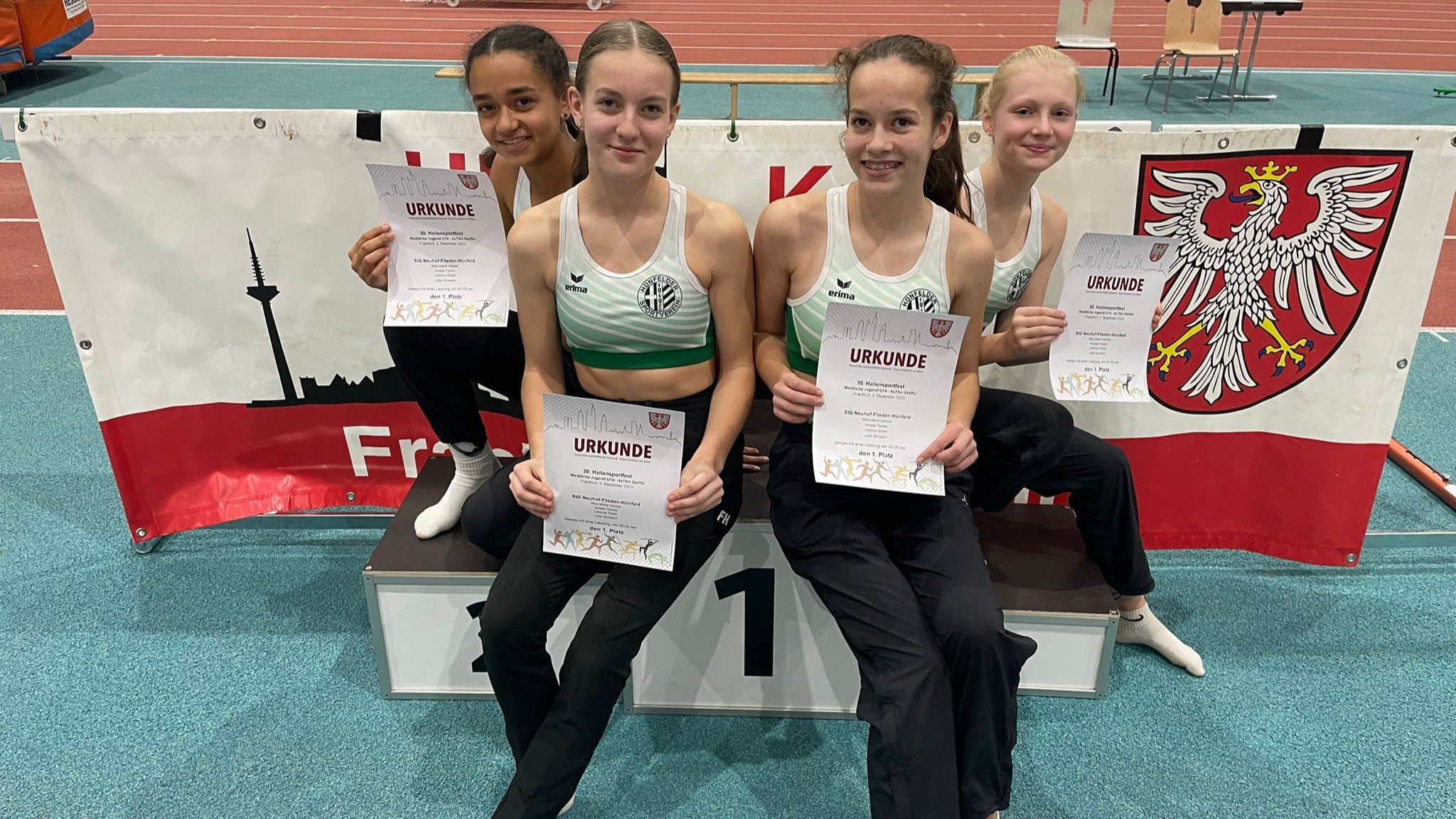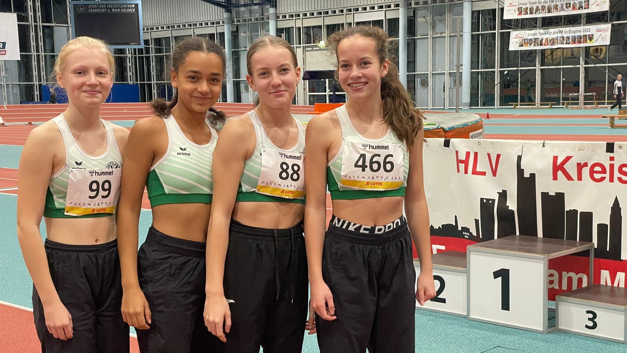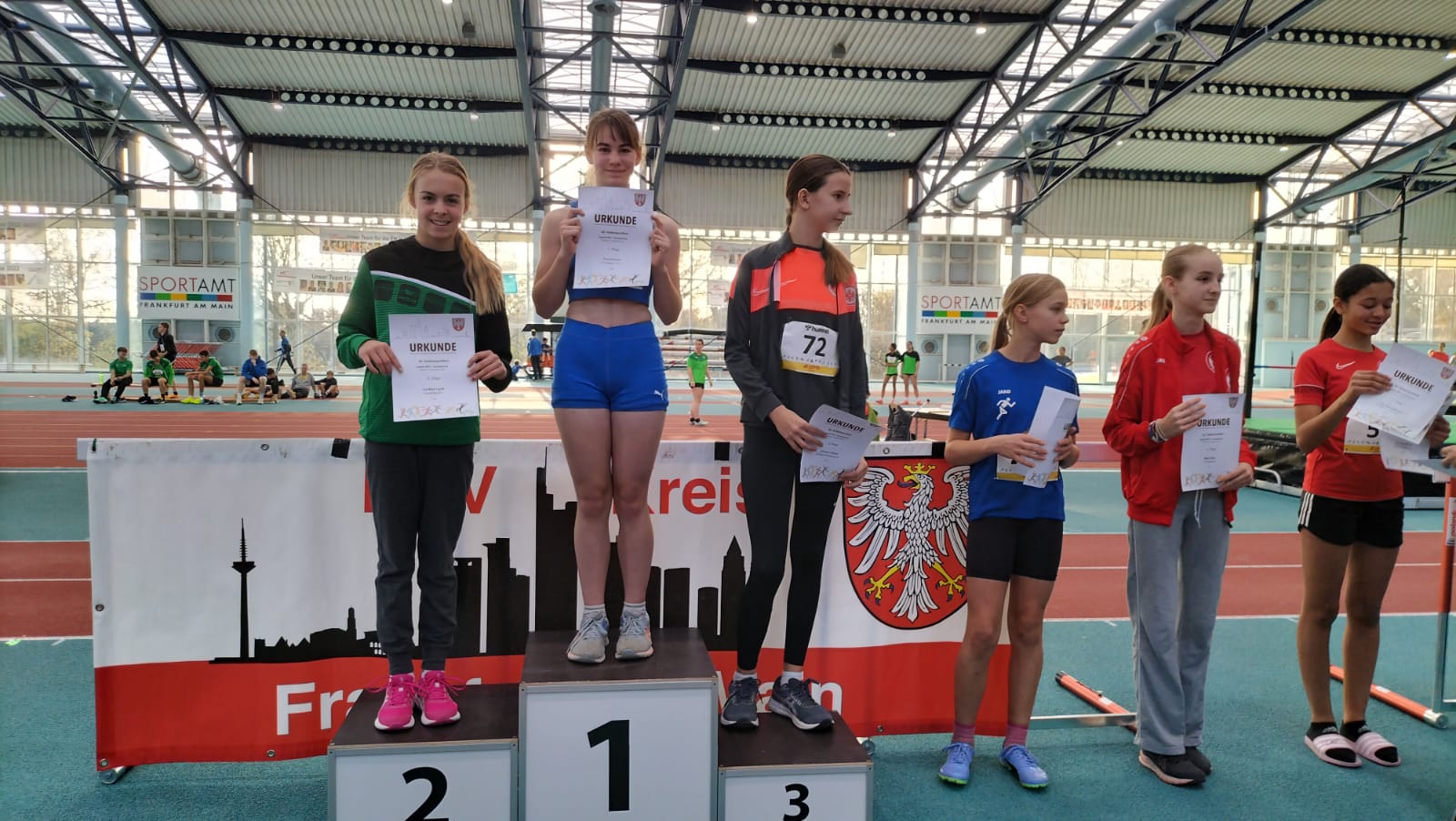 Zum krönenden Abschluss gab es am Ende noch die 4 x 75m-Staffel in der Besetzung Nika Marie Henkel, Amalia Teckie, Lilianna Zirpel und Lotte Schwarz. Alle VIER, man muss es so sagen, sauschnell unterwegs, an zwei Stellen nicht gerade optimal gelaufen und trotzdem eine super Zeit auf die Tartanbahn gebrannt. In der Freiluftsaison stehen die VIER mit 40,72s auf Platz „3“ in der Hessischen Bestenliste, und jetzt sind es nur 40,08 Sekunden auf der engen 200m-Hallenbahn mit 3 engen zu laufenden Kurven. Die erste Mannschaft der Eintracht Frankfurt eine knappe Sekunde dahinter, Platz „3“ gar schon über 3 Sekunden langsamer sind schon ein Wort; und das sind wahrlich keine langsamen Staffeln. Bemüht man mal wieder die Hessische Bestenliste der letztjährigen Hallensaison, dann steht da bei Platz „1“ eine Zeit von 42,33s. All diese Vergleiche zeigen, was für eine tolle Zeit die VIER Mädels gelaufen sind!