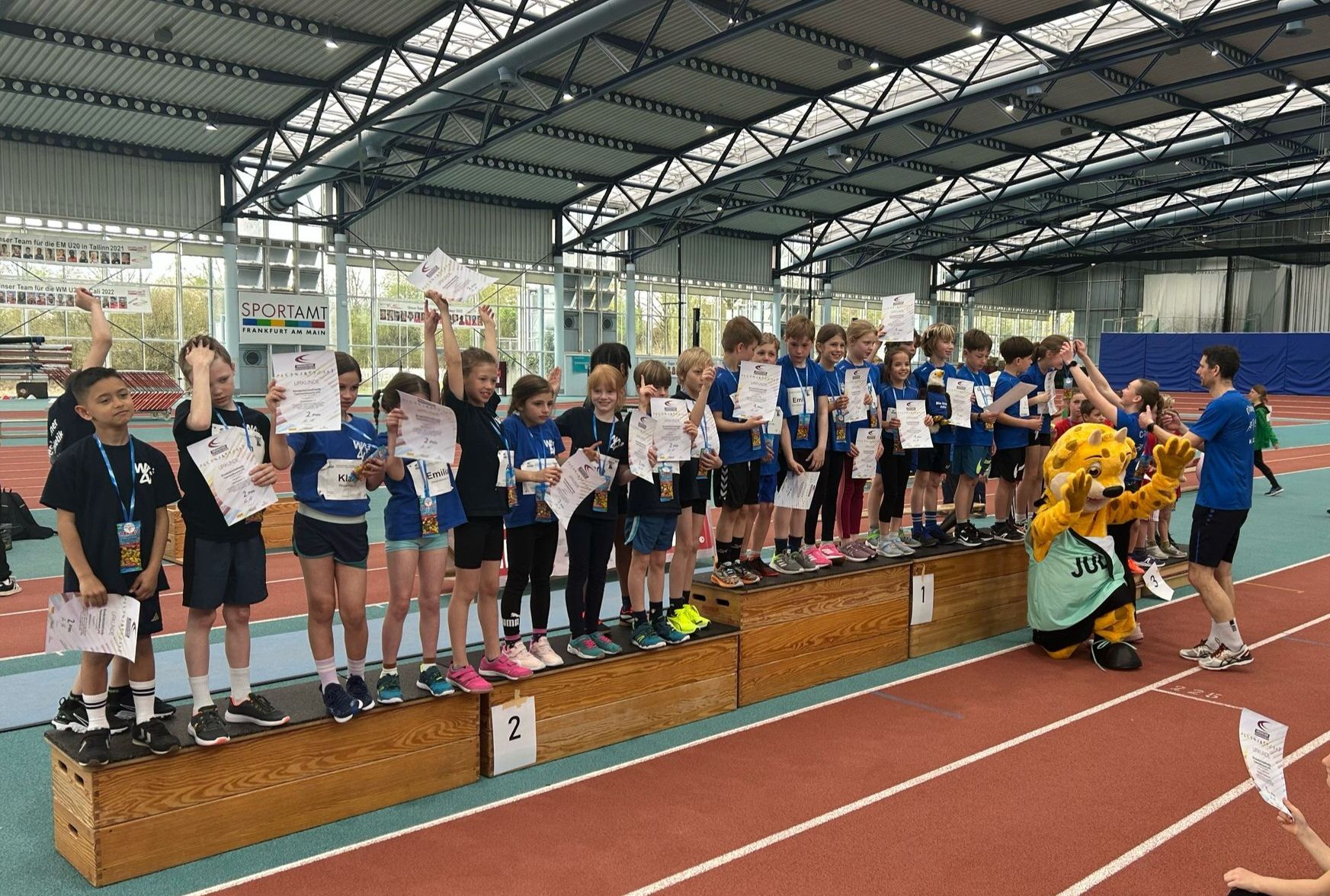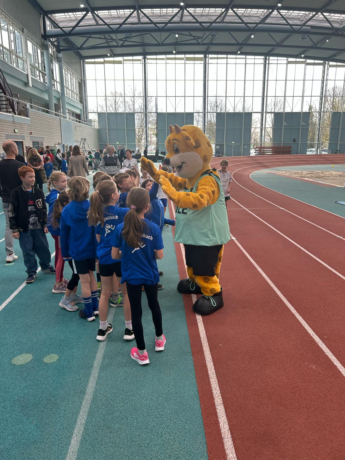 Nach der Begrüßung aller anwesenden Teilnehmer:innen und Unterstützer:innen wurden die teilnehmenden Teams vorgestellt. Gemeinsam wärmten sich alle mit dem Spiel “Löwenjagd“ auf, bei dem auch JuLe, das Maskottchen der Jugendleichtathletik, begeistert mitmachte und für gute Stimmung sorgte.