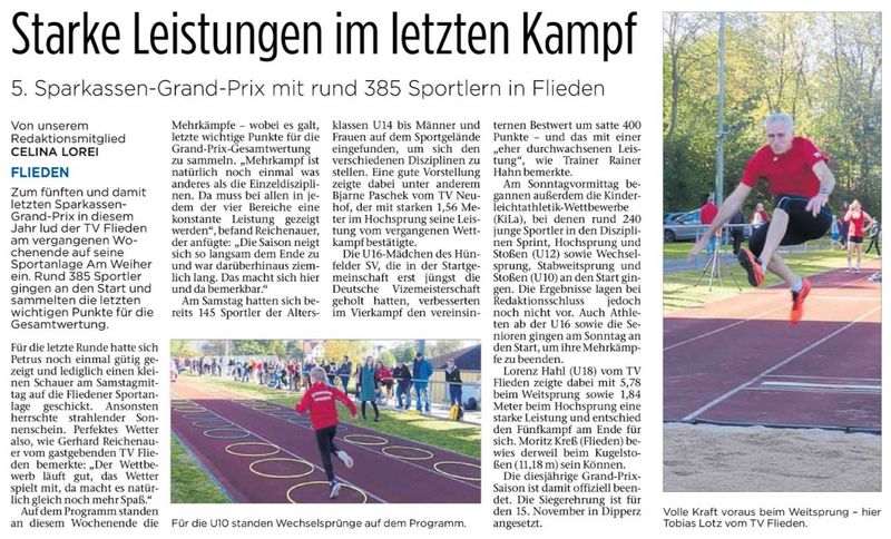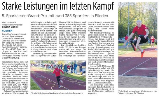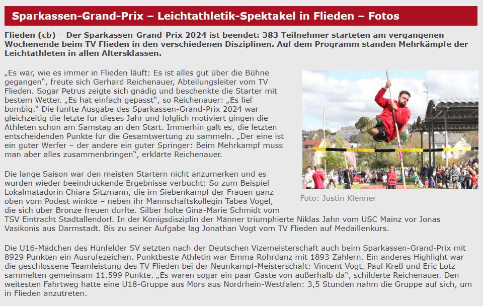 Mit dem 5. Sparkassen-Grand-Prix 2024 in Flieden ist die Sparkassen-Grand-Prix-Saison der Leichtathleten im HLV-Kreis Fulda-Hünfeld zu Ende. Und was war das nochmal für ein Leichtathletik-Event bei gutem Leichtathletik-Wetter. Über 2 Tage verteilt waren 362 Athleten aus 26 Vereinen am Start.