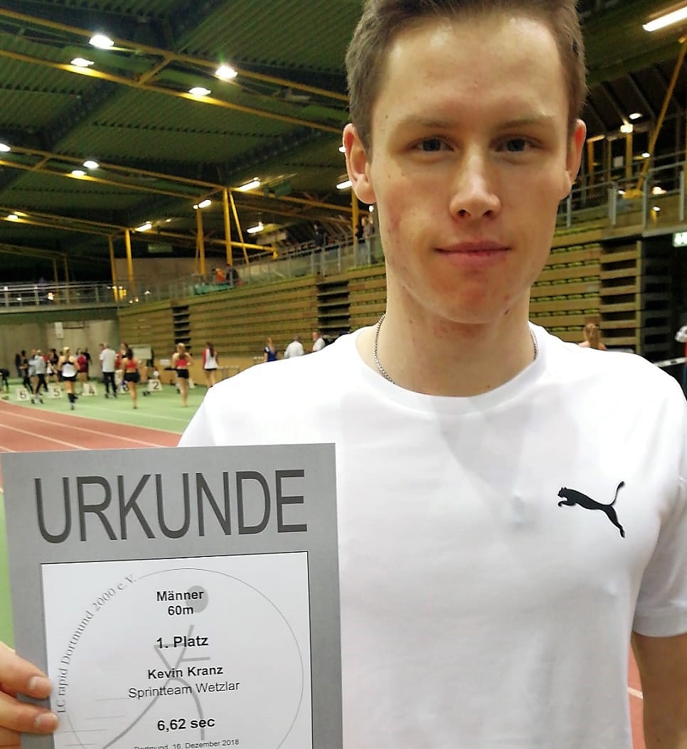Bereits vor einer Woche hatte der 20-Jährige vom Sprintteam Wetzlar in Ludwigshafen seine persönliche Bestzeit über 60 Meter auf 6,70 Sekunden gedrückt, am gestrigen Sonntag in Dortmund ging es nochmals wesentlich schneller. Mit 6,62 Sekunden verbesserte Kranz auch den Hessenrekord seines Vereinskollegen Michael Pohl um eine Hundertstel. Pohl, 29 Jahre alt, hatte als DM-Zweiter 2018 in Dortmund den Rekord über 6,68 und 6,66 auf 6,63 Sekunden gedrückt.