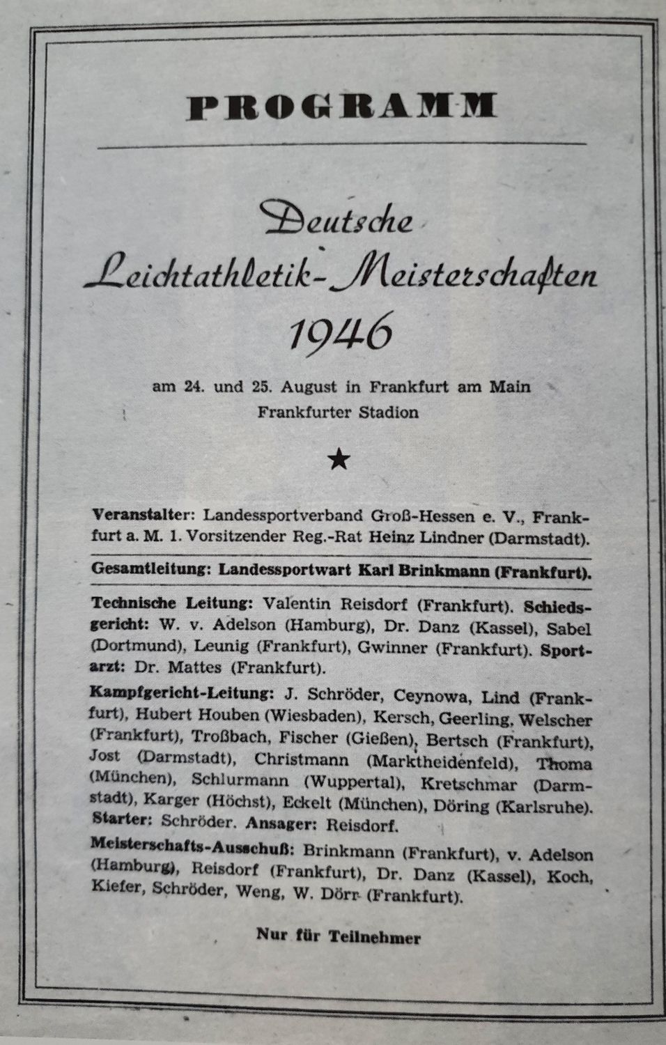 Neben dem sportpolitischen Aufbau des Sports und der Fachgruppe Leichtathletik in Hessen wird der Sportbetrieb aufgenommen. Bereits am 4. August 1946 – eine offizielle Leichtathletik-Organisation gab es noch nicht – finden die 1. Hessischen Meisterschaften der Männer und Frauen im Frankfurter Waldstadion statt.