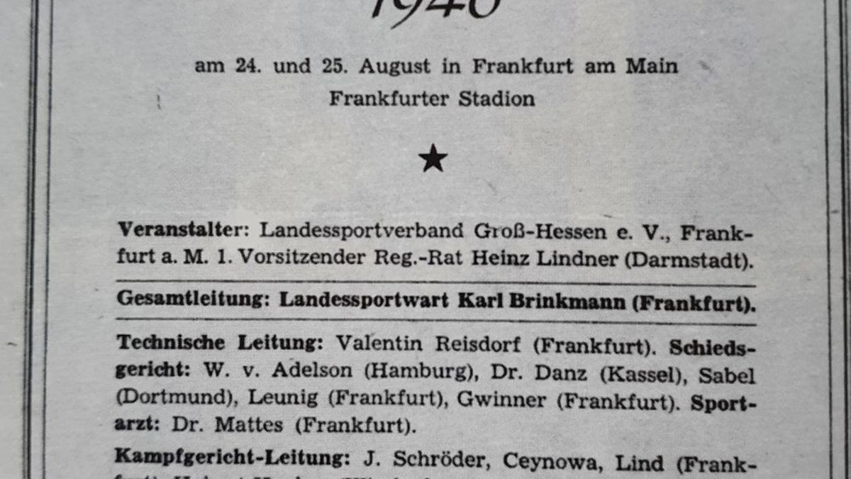 Am 27. Oktober 1945 trafen sich Dr. Max Danz, Valentin Reisdorf, Heinz Karger, Paul Ceynowa, Bruno May, Kurt Koch und Karl Breuermann in der Gaststätte Schmidt in Frankfurt zur Vorbereitung eines Fachausschusses Leichtathletik.