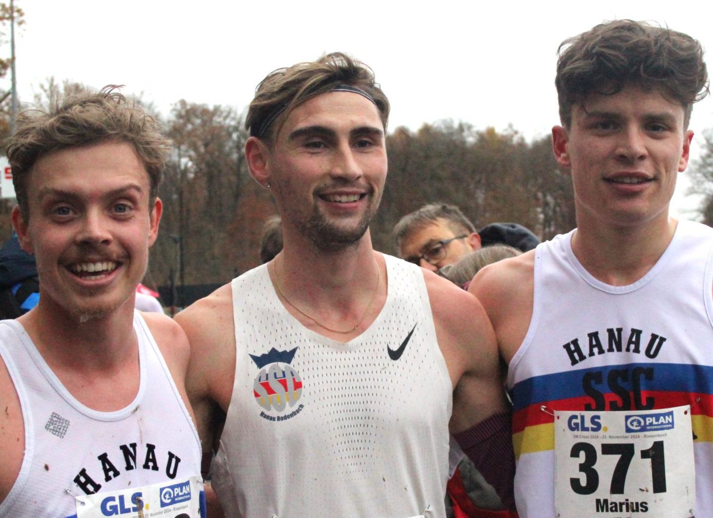 Ebenfalls in die Spitze der “Crosslauf-Bundesliga” stieß die Hanau-Rodenbacher U23 vor. Angeführt von dem unermüdlich gegen Matsch, schnelle Richtungswechsel und Tempowechsel kämpfenden Fynn Becker musste sich das SSC-Team unter acht Vereinen mit 64 Punkten lediglich der LG Karlsruhe (48 Punkte) geschlagen geben. Dabei ragte aus hessischer Sicht Fynn Becker auf Rang sieben in 23:38 Minuten heraus. Er spurtete noch vor Hessenmeister Bastian Mrochen (Kassel/9. Platz/23:50 Minuten) und direkt hinter dem mehrfachen deutschen Meister Tom Förster (Braunschweig/23:29 Minuten) ins Ziel. Luis Braukhoff (25.Platz/25:02 Minuten) und Paul Fecher (32.Platz/25:36 Minuten) komplettierten die SSC-Silber-Junioren. Einen weiteren siebten Einzelplatz feierte Christian Ache im 119 Teilnehmer umfassenden U18-Feld über 4,3 Kilometer als großen Erfolg. Gemeinsam mit Tom Knauer (27.Platz) und Tim Völker (69.Platz) gab es ebenfalls Rang sieben in der Teamwertung, Nils Schrodt belegte den 79.Platz. Die vier Youngster überzeugten inmitten des größten Teilnehmerfeldes durch eine stabile Renngestaltung, die für zukünftige DM-Auftritte auf weitere Erfolge hoffen lässt.