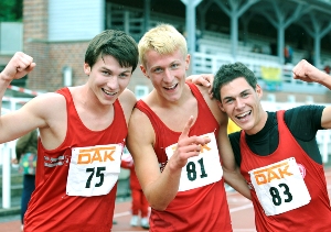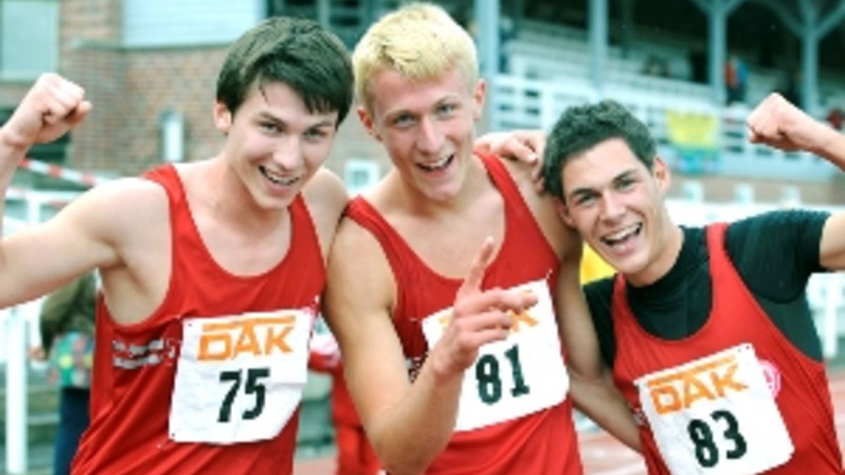 Großer Erfolg für Aron Schreiner und die Mannschaft der LG Eintracht Frankfurt bei den Deutschen Mehrkampfmeisterschaften in Potsdam. Mit 7161 Punkten holte sich der Frankfurter den Zehnkampf-Titel bei den B-Jugendlichen, erfolgreich war auch die Mannschaft mit Schreiner, Marius Weber (6520 Punkte/6.) und Rouben Czwikla (6489/7.). Das LGEF-Team lag mit 20.170 Punkten letztlich deutlich vor der LG Leinfelden-Echterdingen (18.155) und dem SV Sonsbeck (17.598). Schreiner gewann in Potsdam seinen ersten Einzeltitel auf nationaler Ebene vor Andre Karasch (LC Paderborn/6929 Punkte) und Stephan Hartmann (LG Nord Berlin/6789 Punkte). Bei Windstille war der Hesse mit 11,56 Sekunden über 100 Meter in den Wettkampf gestartet, es folgten 6,85 Meter im Weitsprung und überragende 16,35 Meter im Kugelstoßen. Mit 1,81 Meter im Hochsprung und 53,18 Sekunden über 400 Meter beendete er den ersten Tag.<ENDE/> Von Rang drei begann eine Nacht später die Aufholjagd. 14,94 Meter über 110 Meter Hürden, ganz starke 48,94 Meter mit dem Diskus sowie das beste Stabhochsprungergebnis aller Teilnehmer (4,40 Meter) brachten Schreiner in eine hervorragende Ausgangsposition. Die Meisterschaft ließ er sich im Speerwurf (49,77 Meter) und mit einer kämpferischen Leistung über 1500 Meter (5:22,18 Minuten) nicht mehr nehmen. Insbesondere der Stabhochsprung-Wettkampf mit vier Regenpausen hatte sich zu einer nervenaufreibenden Angelegenheit entwickelt; für Schreiner auch deshalb, weil er im Vorjahr in dieser Disziplin einen Nasenbeinbruch erlitten hatte. Weber brachte seine besten Ergebnisse über 400 Meter 50,86) und über 1500 Meter (4:39,35). Czwikla lief gute 14,94 Sekunden über 110 Meter Hürden und überquerte mit dem Stab 3,90 Meter.