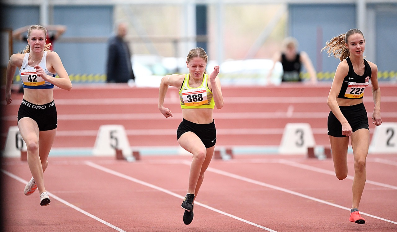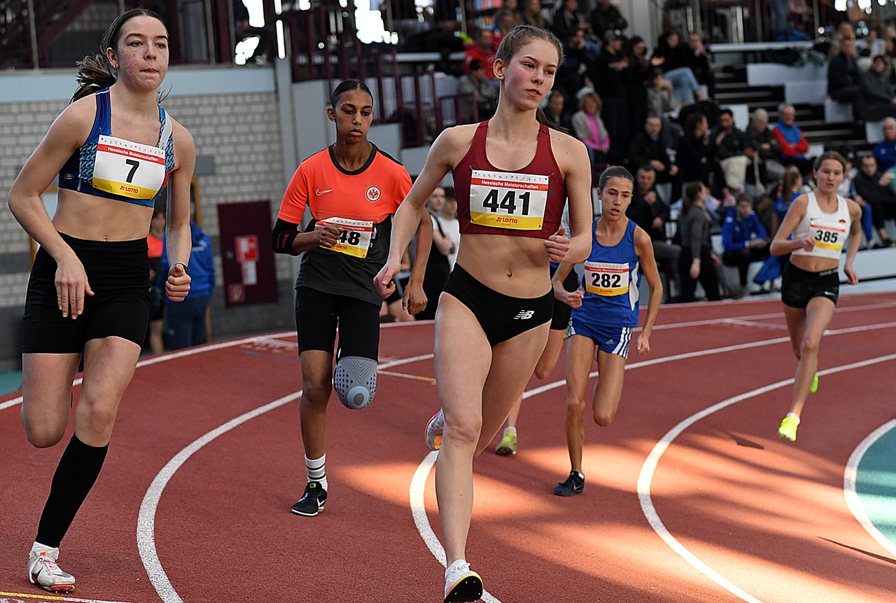 Bei den Mädels blieb im Sprint lediglich Pia Pätzel (LG VfL/SSG Bensheim) mit 7,88 Sekunden ganz klar unter acht Sekunden. Lotta Bayer (SG DJK Hattersheim) hatte als Zweite (8,09 sec.) schon ein etwas größeren Rückstand. Auf der Hallenrunde ließ Ina Ehrmann (LG Dornburg) mit 25,96 Sekunden nichts anbrennen. Beeindruckend, was Jana Marie Becker bei ihrer Premiere im Trikot des Königsteiner LV auf den roten Tartanbelag zauberte. Am Samstag flog die Bundeskaderathletin bei den 400 Metern in 55,67 Sekunden über die Bahn und auf den zweiten Platz der deutschen Jahresbestenliste (U18). Die Siegeszeit hätte auch ganz locker gereicht, die 400 Meter der Frauen mit über vier Sekunden Vorsprung zu gewinnen. Welten im Langsprint. Auch die 800 Meter gestaltete Becker souverän im Alleingang und ist mit 2:10,64 Minuten aktuell die schnellste deutsche U18-Läuferin. Amelie Tortell (TSV Friedberg-Fauerbach), sie gehört noch der W15 an, wurde mit 2:19,23 Minuten Zweite. Die 1500 Meter endeten durch Charlotte Weigand (5:13,26 min.) sowie Elisabeth Schneider (5:14,00 min.) mit einem Doppelsieg für den ASC 1900 Breidenbach. Fabienne Maxime Dammeyer (Eintracht Ffm.) setzte sich in 10:50,43 Minuten über 3000 Meter durch. Über die 60 Meter Hürden machten die beiden Eintrachtlerinnen Fara Signy Köchling (9,16 sec.) und Julia Badenhausen (9,31 sec.) den Titelkampf unter sich aus. Auch bei den 4x200 Meter gab ein Eintracht-Team (Badenhausen, Köchling, Egberts, Ponndorf) mit 1:45,13 Minuten ganz klar den Ton an und will auch bei den „Süddeutschen“ vorne mitmischen. Sara Hamin (SG Enkheim) wurde im Hochsprung mit 1,63 Metern ihrer Favoritinnenrolle gerecht. Greta Rumpf (LSG Goldener Grund Selters) darf nach ihren 2,80 Metern in Kalbach nun auch in Sindelfingen den Stab in die Hand nehmen. Die beiden besten Weitspringerinnen trennten lediglich vier Zentimeter. Ina Ehrmann (LG Dornburg) setzte sich mit 5,33 Metern gegen Lotta Bayer (SG DJK Hattersheim/5,29 m) durch. Nach „Hop-Step-Jump“ reichten Theresa Lukas (LG Dornburg) 11,19 Meter zum Dreisprungsieg. Nadjela Wepiwe (TSG Wehrheim) setzte sich im Kugelstoßen mit der neuen Bestmarke von 12,77 Metern im Kugelstoßen gegen Jule Katharina Koch (TV Wächtersbach/12,60 m) durch.