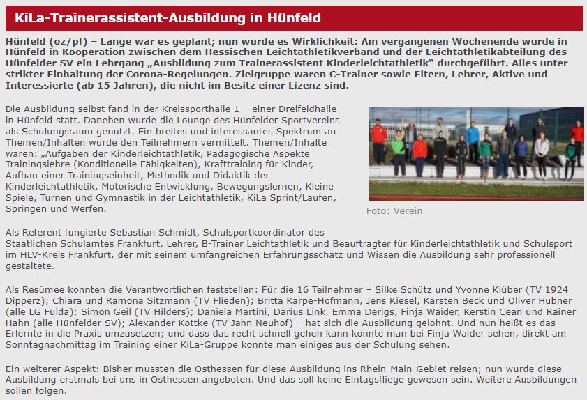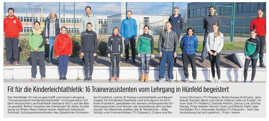 Lange war es geplant; nun wurde es Wirklichkeit! Am 4.12. (ganztags) und am 5.12. (bis Mittag) wurde in Hünfeld in Kooperation zwischen dem Hessischen Leichtathletikverband und der Leichtathletikabteilung des Hünfelder SV ein Lehrgang "Ausbildung zum Trainerassistent Kinderleichtathletik" durchgeführt. Alles unter strikter Einhaltung der Corona-Regelungen.