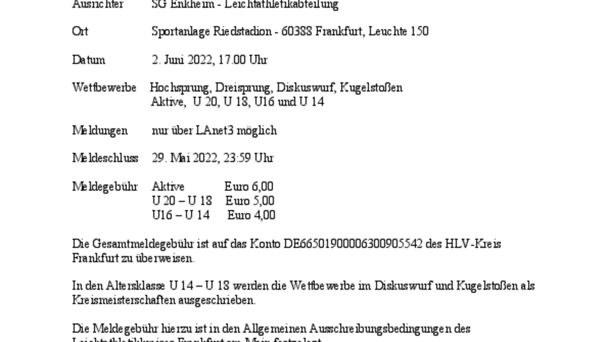 des Leichtathletikkreises Frankfurt am Main am 2. Juni 2022 in Frankfurt am Main – Enkheim - Sportanlage Riedstadion