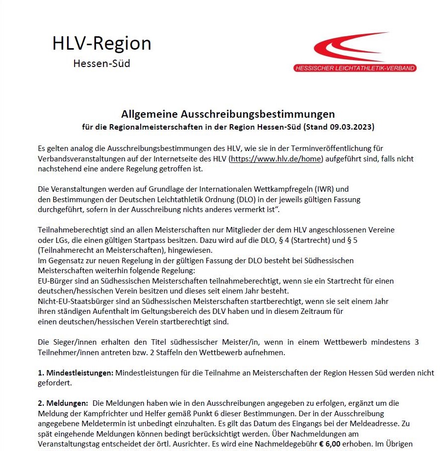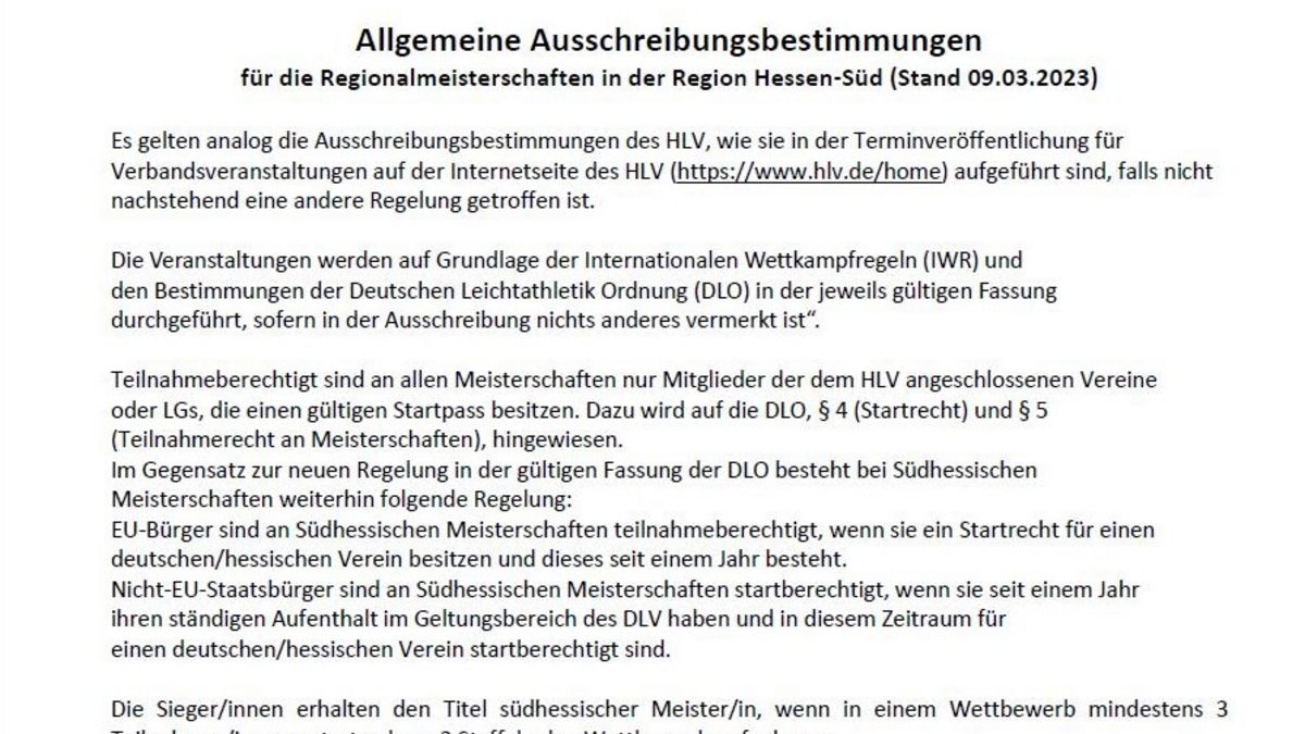 zum 09.03.2023 wurden die Allgemeinen Ausschreibungsbestimmungen für die Regionalmeisterschaften in der Region Hessen-Süd aktualisiert.