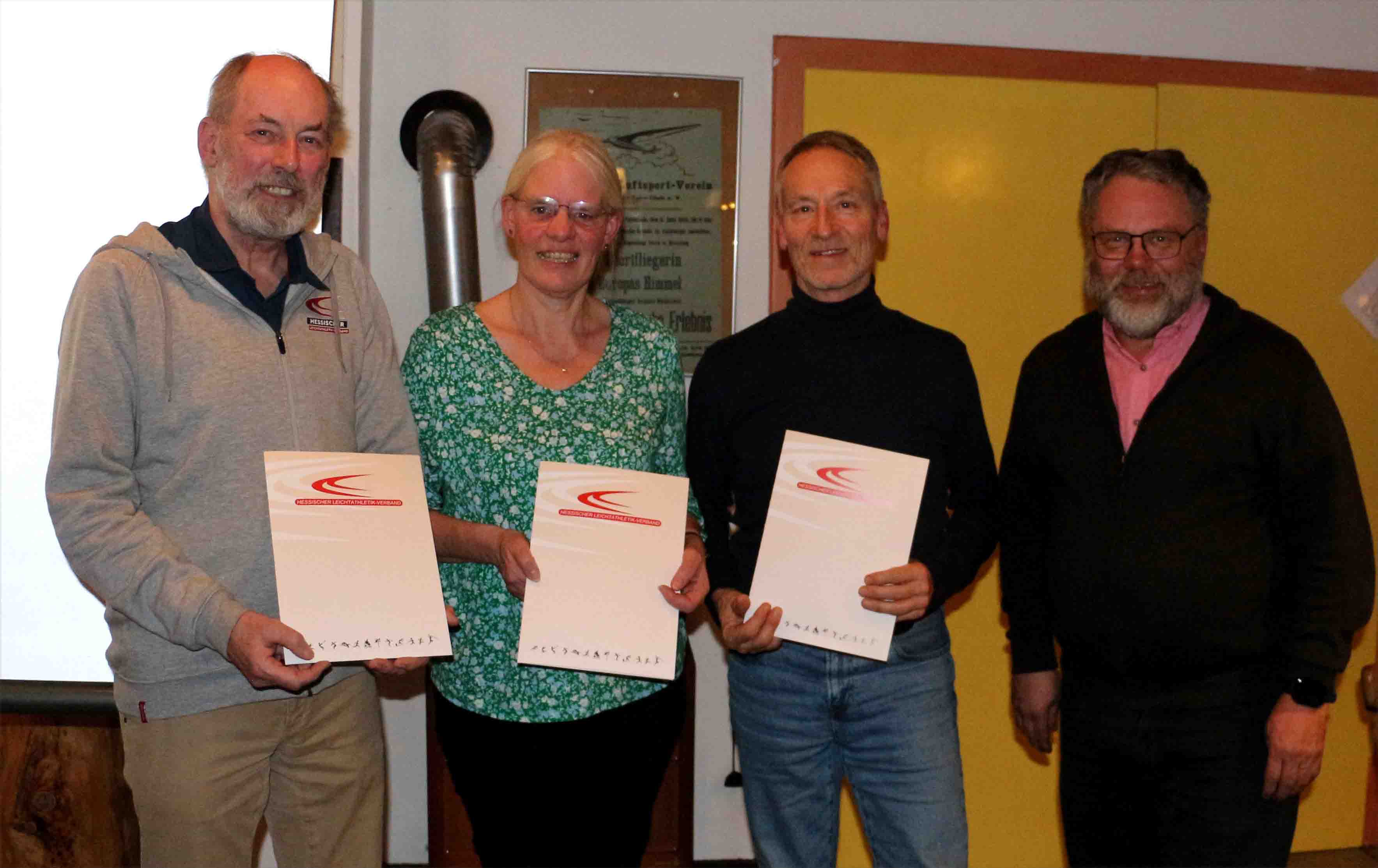 Als sich alle bereits auf den Schluss des Kreistages einstellten, zog der Kreisvorsitzende Hagen Frantz noch drei Umschläge aus seiner Tasche und überraschte drei Anwesende mit Ehrungen. Zunächst erhielt Thomas Weise, SSC Bad Sooden-Allendorf, für seinen langjährigen Einsatz für die Deutsche Leichtathletik als erfolgreicher Trainer, Veranstaltungsorganisator und seine Mitarbeit im Kreisvorstand die Auszeichnung "DLV Silber" in Form von Urkunde und Anstecknadel überreicht. Anschließend bat Hagen Frantz seine Frau Martina, TV Hess. Lichtenau, für die gleiche Ehrung nach vorn. Bei ihr war die Begründung vor allem ihre jahrelange Kampfrichtertätigkeit, die von der Kreis- über die Regional- und Landesmeisterschaft bis hin zu mehreren Deutschen Meisterschaften umfasst, aber auch ihre Mitarbeit im Kreisvorstand. Abschließend erhielt der Stellvertretende Kreisvorsitzende Jochen Miersch sogar noch "DLV-Gold", insbesondere für seine 24jährige Tätigkeit als Landeslaufwart, aber auch u. a. für sein Engagement als Lehrbeauftragter Kampfrichterwesen.