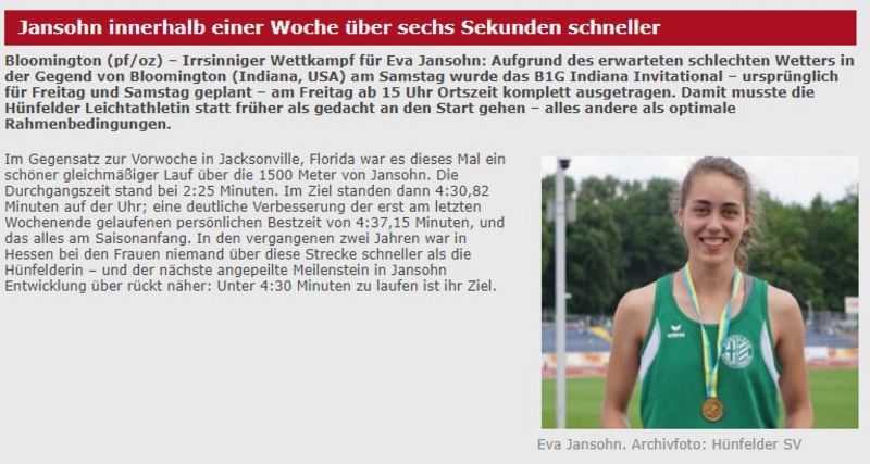 B1G Indiana Invitational #2, Bloomington, Indiana; neue Bestzeit für Eva über 1.500m