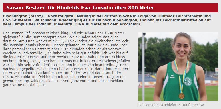Der Hünfelder SV und damit auch der HLV-Kreis Fulda-Hünfeld haben mit Eva Jansohn eine in unserer Region rar gewordene Top-Athletin! In Hessen ganz vorne, in Deutschland ganz vorne mit dabei!