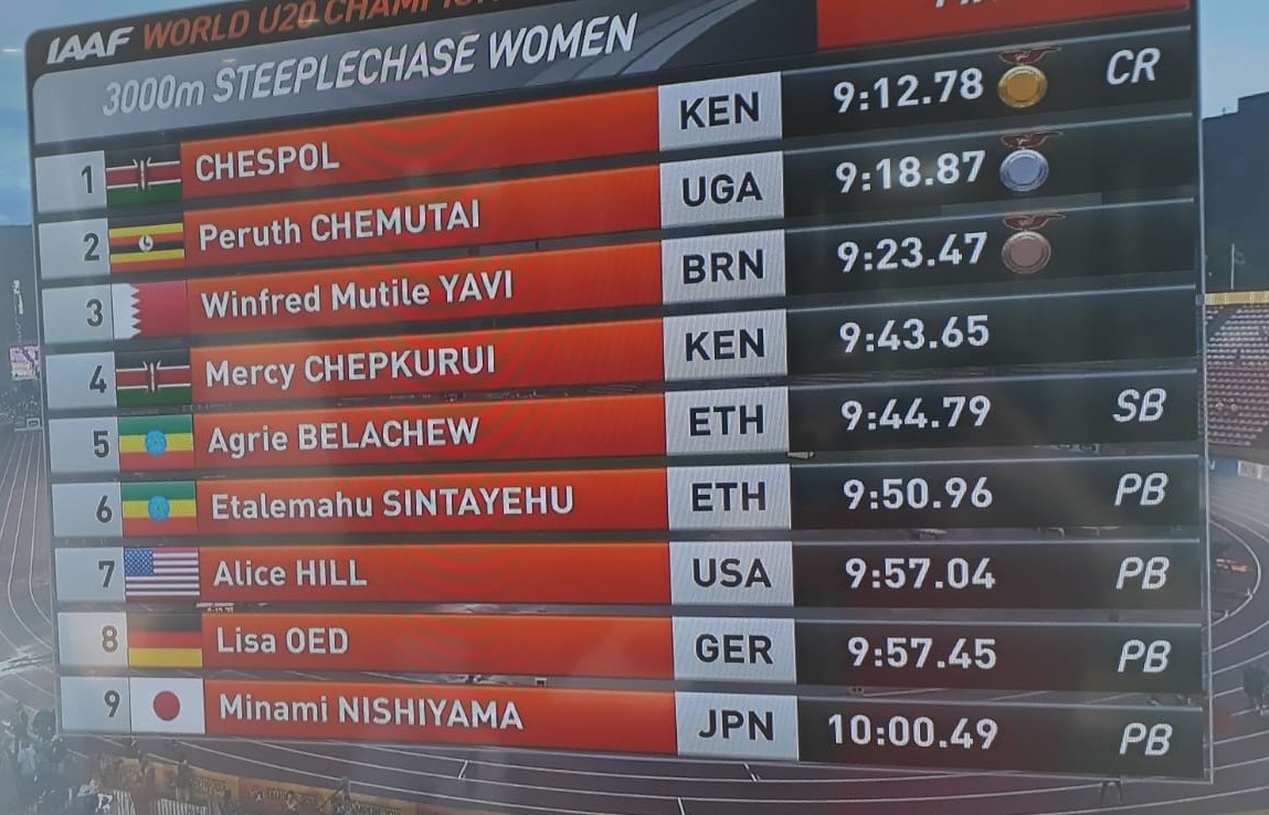 „Nicht hundertprozentig zufrieden“ war die zweite deutsche Final-Teilnehmerin, Lisa Vogelgesang (Eintracht Hildesheim) mit ihrem 14. Platz in 10:07,67 Minuten. Im Kampf um Gold nahm die U20-Weltrekordhalterin und WM-Sechste Celliphine Chespol schließlich das Heft in die Hand. Die Kenianerin setzte sich erst mit einer Dreiergruppe aus dem Sextett der Afrikanerinnen ab und schüttelte dann Schritt für Schritt auf dem Weg zu einem Meisterschaftsrekord von 9:12,78 Minuten ihre Verfolgerinnen Peruth Chemutai (Uganda/9:18,87) und Winfred Mutile Yavi (9:23,47) ab.