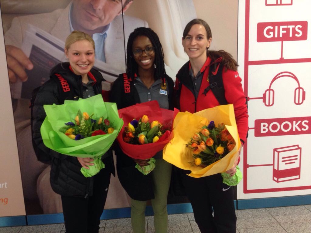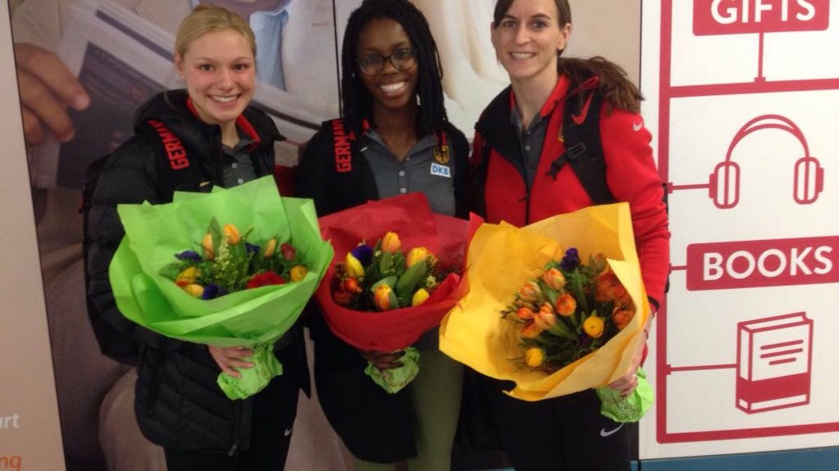 Der Hessische Leichtathletik-Verband (HLV) hat seine drei erfolgreichen EM-Teilnehmerinnen von Belgrad am Flughafen Frankfurt am Main begrüßt und zu ihren Leistungen gratuliert. Claudia Salman-Rath (LG Eintracht Frankfurt), Lisa Mayer (Sprintteam Wetzlar) und Maryse Luzolo (Königsteiner LV) sind also wieder in heimischen Gefilden. Glücklich und zufrieden und etwas müde. Martin Rumpf, HLV-Vizepräsident Leistungssport, hatte den dritten Platz von Salman-Rath mit hessischem Rekord von 6,94 Metern bereits zuvor mit den Worten gewürdigt: „Was für ein Kracher von Claudia!“ Die 30-jährige Weltklasse-Siebenkämpferin und jetzt auch -Weitspringerin war bei ihrer Ankunft in Deutschland noch immer mit der Aufarbeitung ihres ersten internationalen Medaillengewinns beschäftigt. Und letztlich hatte sie im Finale keinen Versuch unter 6,65 Meter gezeigt. Überglücklich war auch Mayer, die im 60-Meter-Finale mit Platz fünf (7,19 Sekunden) beste Deutsche wurde. Luzolo sammelte mit Rang zehn im Weitsprung wichtige internationale Erfahrung. Eine wirkliche Pause gibt es für das Trio aber nicht. Mayer steigt am Donnerstag wieder ins Training ein, Salman-Rath und Luzolo fliegen am Freitag ins Trainingslager.