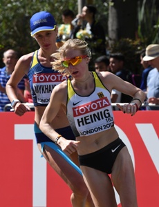 Katharina Heinig hat sich bei ihrem ersten WM-Auftritt achtbar präsentiert. Die 27-jährige Marathonläuferin, die für die LG Eintracht Frankfurt startet, belegte am Sonntagnachmittag auf dem Rundkurs in der britischen Metropole nach 2:39:59 Stunden den 39. Platz. Beste Deutsche war Fate Tola von der LG Braunschweig in 2:33:39 Stunden (Platz 22). Den WM-Titel gewann die gebürtige Kenianerin Rose Chelimo, die seit etwas mehr als achtzehn Monaten für Bahrain startet. Sie benötigte für die 42,195 Kilometer lange Strecke 2:27:11 Stunden und lag nach einem in der Schlussphase dramatischen Dreikampf knapp vor der zweimaligen Weltmeisterin Edna Kiplagat (Kenia/2:27:18) und der zeitgleichen US-Amerikanerin Amy Cragg.