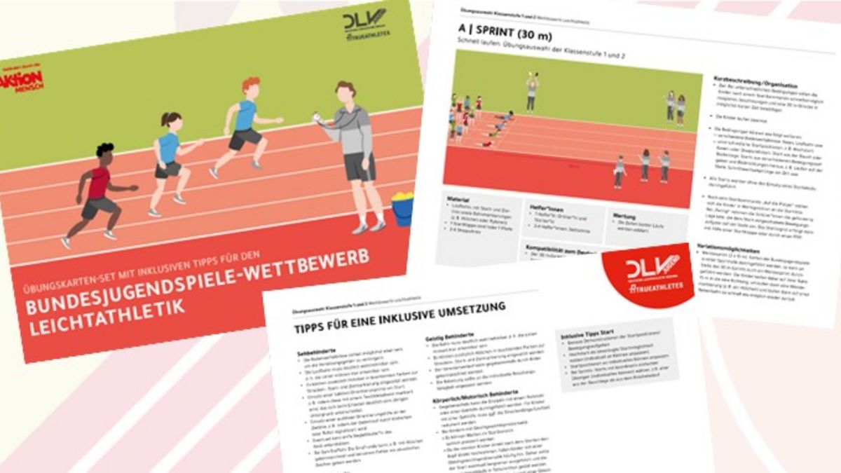 Über die Förderung der „Aktion Mensch“ konnten wir ein Übungskarten-Set mit einer Auflage von 5.000 Stück drucken lassen. Das Set beinhaltet insgesamt 28 verschiedene Karten. Auf der ersten Karte finden sich übergreifende Hinweise, wie behinderte Kinder in der Leichtathletik teilhaben können. Auf den übrigen 27 Karten sind die Übungskarten aus dem offiziellen Handbuch Bundesjugendspiele für die Klassen 1 bis 4 abgebildet. Jeweils auf der Rückseite sind Ideen für die inklusive Umsetzung der jeweiligen Übung zu finden. Die Karten sind sowohl für den Einsatz im Sportunterricht als auch bei der Durchführung der Bundesjugendspiele (als Stationskarten) vorgesehen.