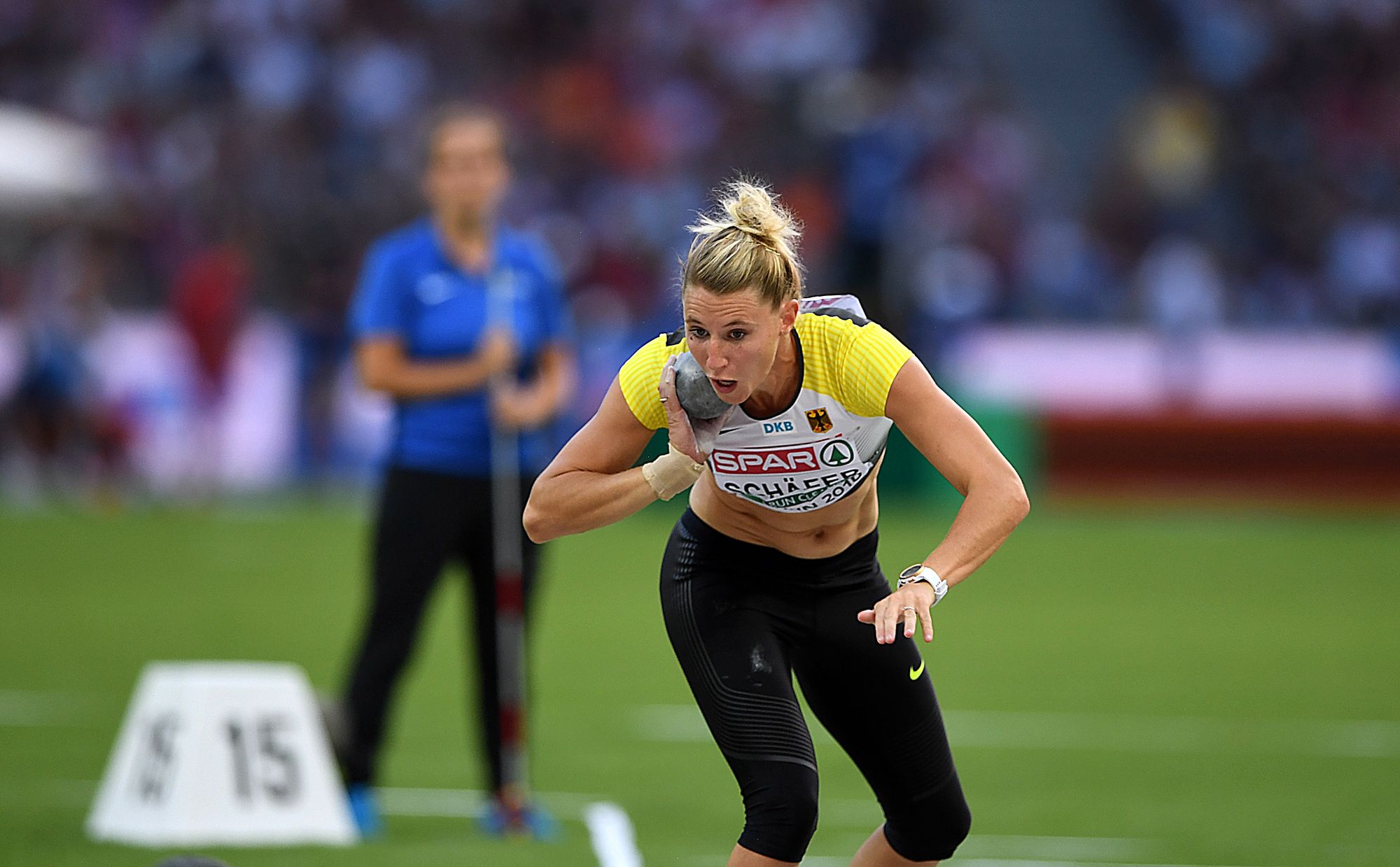 An einem ereignisreichen und stimmungsvollen Donnerstagabend, an dem Thomas Röhler Europameister im Speerwerfen wurde und Andreas Hofmann Zweiter; Pamela Dutkiewicz über 100 Meter Hürden auf den Silberplatz sprintete und Cindy Roleder auf Rang drei, verschaffte sich Vizeweltmeisterin Carolin Schäfer eine gute Ausgangsposition für den zweiten Siebenkampf-Tag. Und womöglich legte die Frankfurterin den Grundstein für eine Medaille im Kugelstoßen, also in einer Disziplin, die in dieser Saison - vorsichtig formuliert - nicht zu ihren Stärken gehörte. Erwähnt seien in diesem Zusammenhang ihre drei ungültigen Versuche beim Meeting in Götzis. Weil sie dort patzte, musste Schäfer drei Wochen später in Ratingen die EM-Norm nachlegen und wies mit 6.549 Punkten eindrucksvoll ihre internationale Klasse nach. Ihre Kugelstoß-Leistung Mitte Juni: 13,53 Meter.