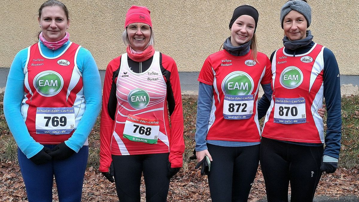 Bild 2Frauen: Erstmals seit 2018 sicherten sich die Athletinnen des TuSpo Borken im Schwalm-Eder-Laufcup mit (von links) Anne Hummel, Katja Stilting, Marie Südmeyer und Yvonne Südmeyer die Mannschafts-Trophäe der Frauen. Es fehlt Johanna Degenhardt. (zct)