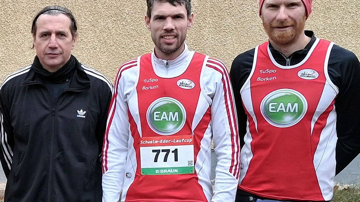 Bild 1 Männer: Erfolgreich verteidigten die Männer des TuSpo Borken im Schwalm-Eder-Laufcup 2025 ihren Pokal in der Mannschafts-Wertung der Männer. Unser Bild zeigt (von links) Klaus Stern, Martin Herbold und Jonas Degenhardt beim Finale in Ziegenhain. (zct)
