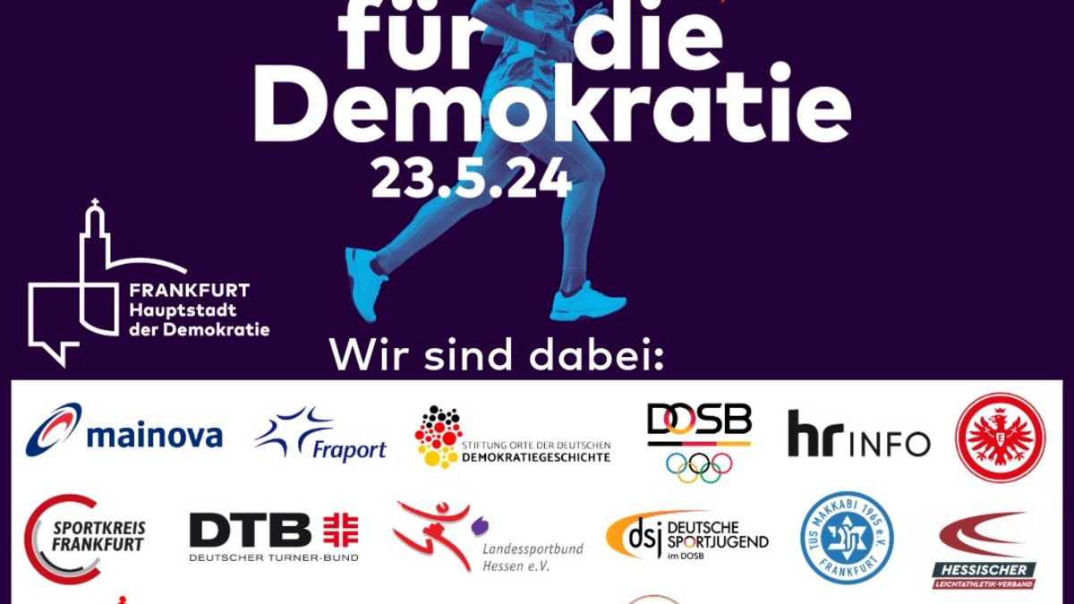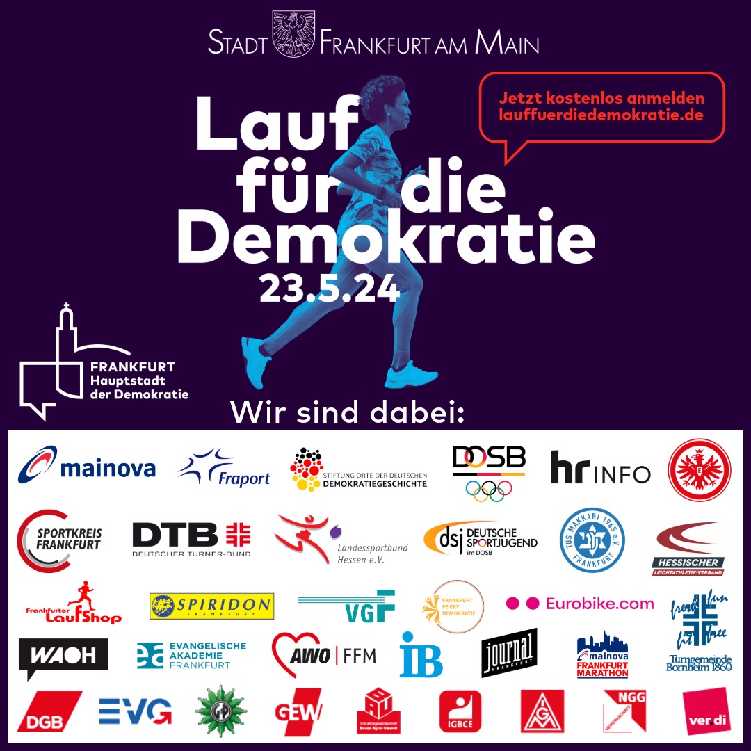 Der “Lauf für die Demokratie” ist eine Initiative der Stadt Frankfurt mit der Unterstützung von Mainova, Fraport AG, Stiftung Orte der deutschen Demokratiegeschichte & DOSB.