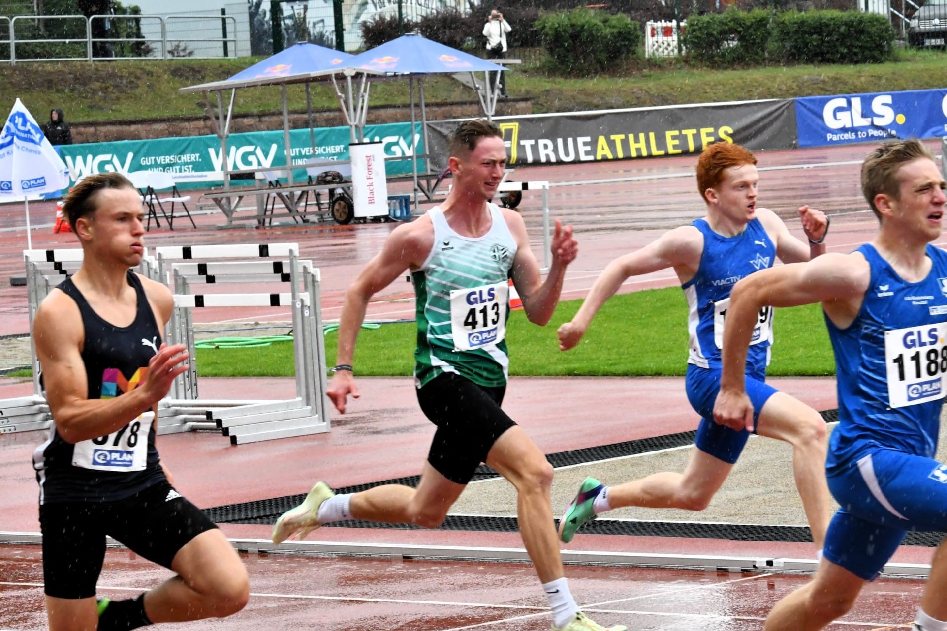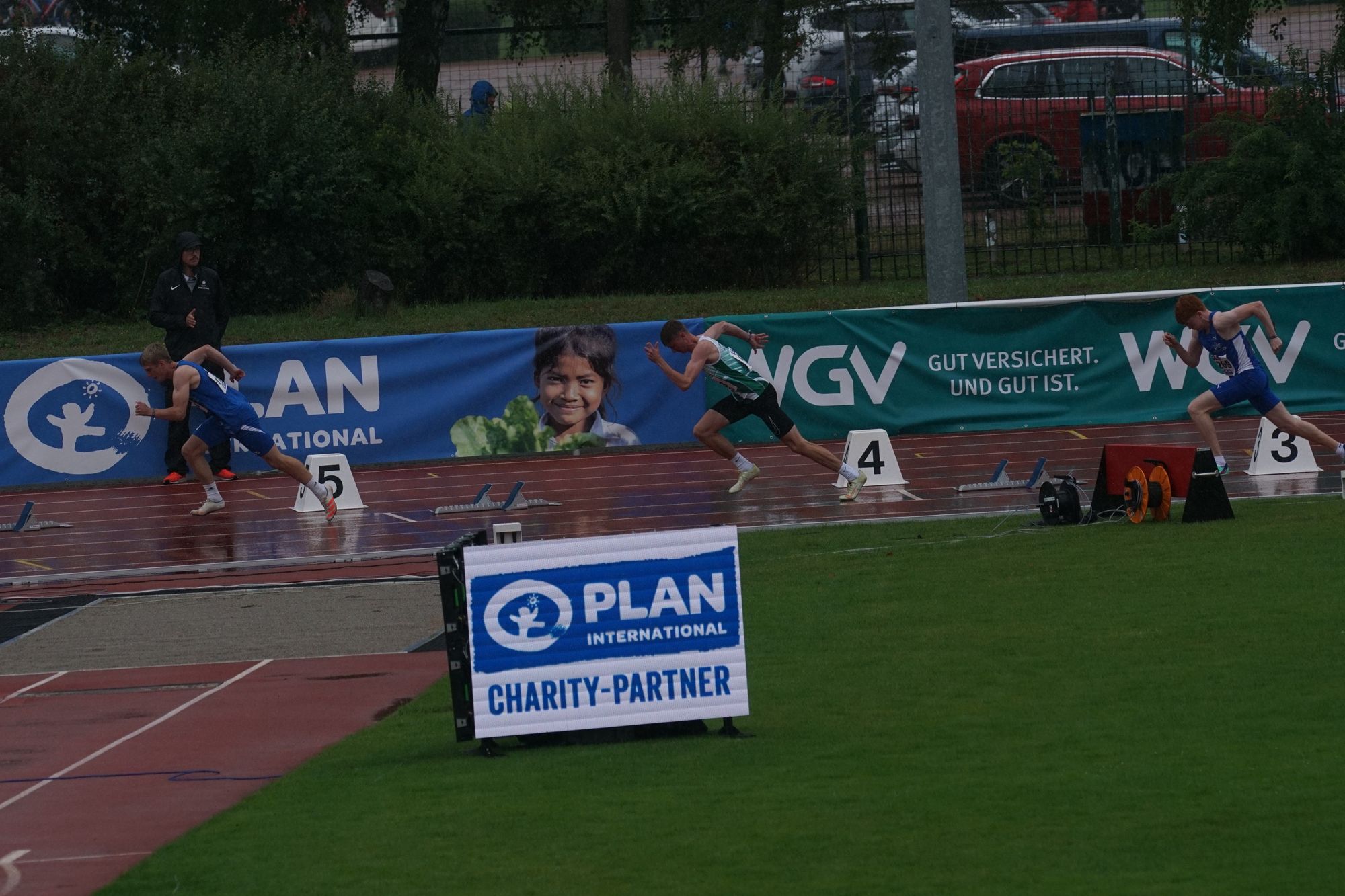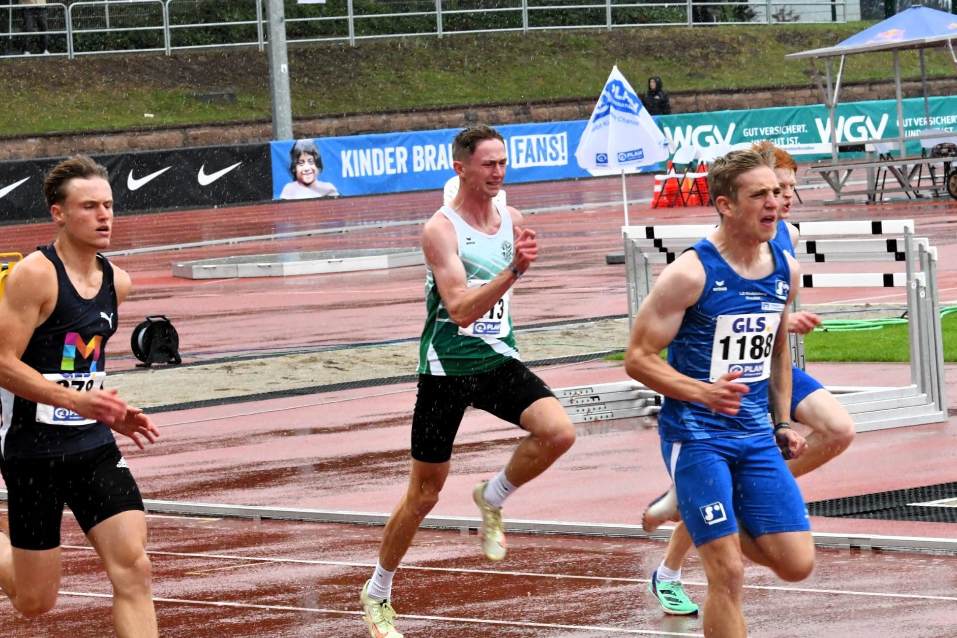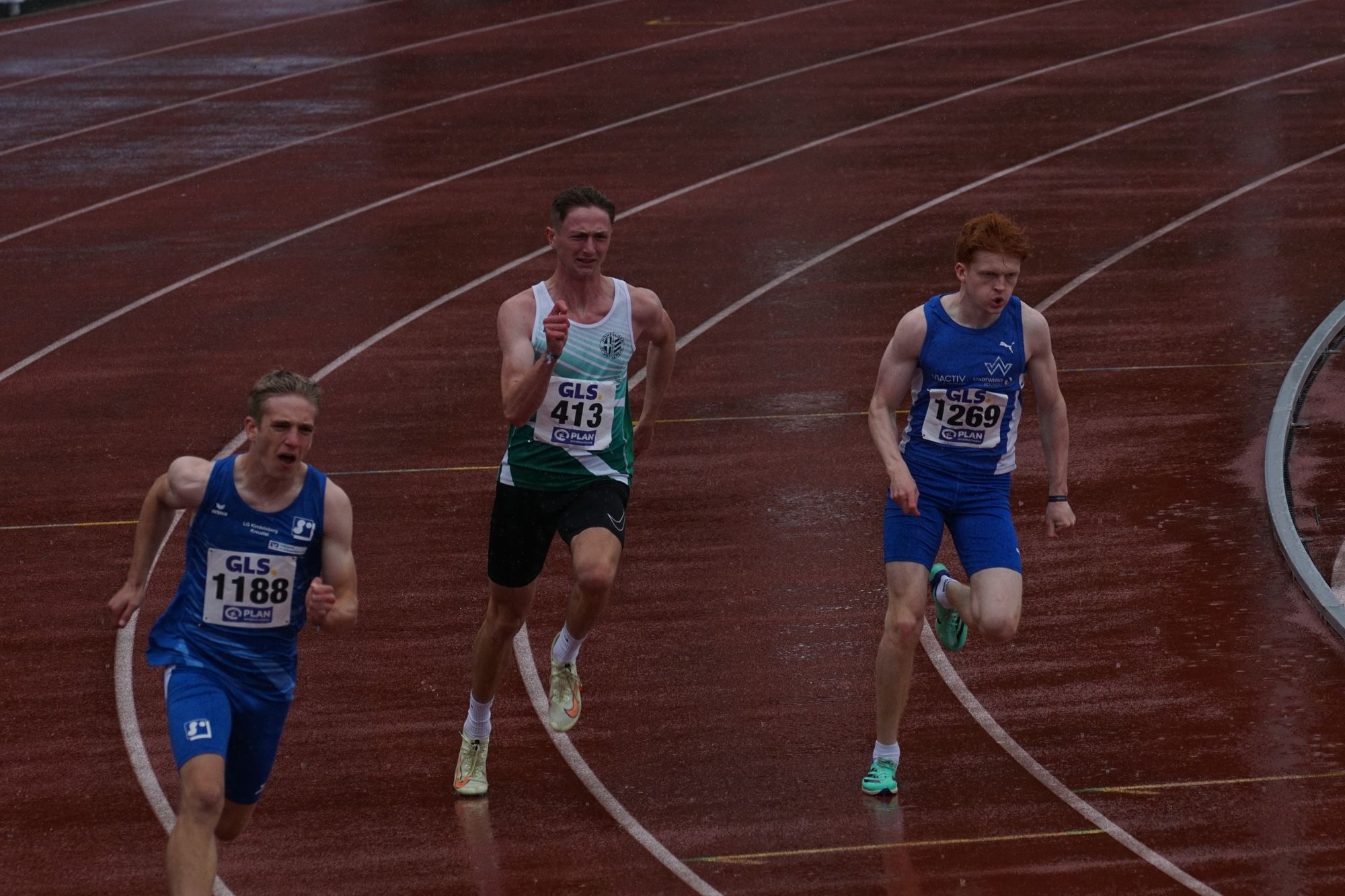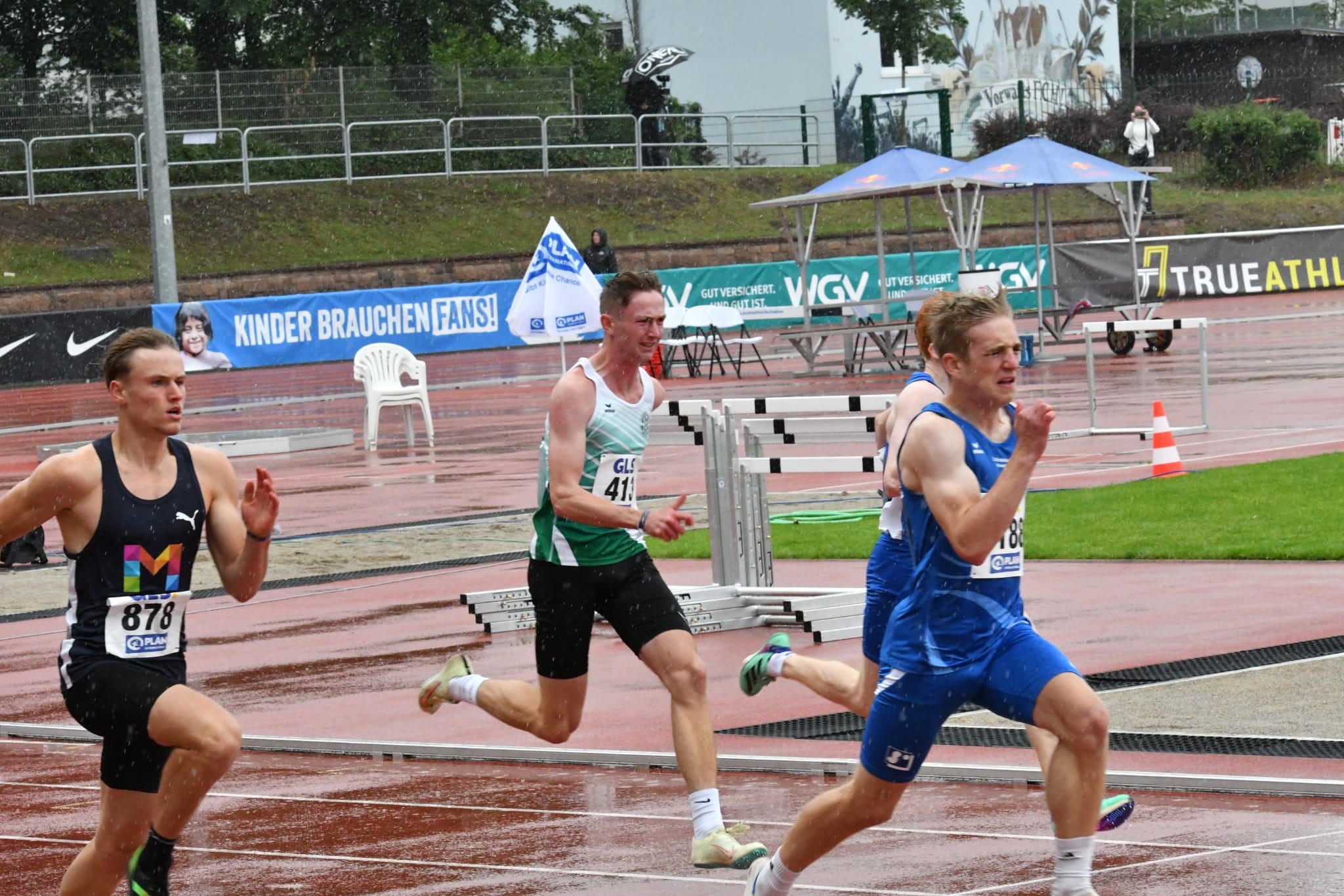 Der Sonntag startet wie im Wetterbericht schon angekündigt mit Regen. Um 13:50 Uhr fällt dann planmäßig der erste Startschuss für den 200m-Wettbewerb. Am Start sind in 7 Läufen 53 Teilnehmer. Darian startet im zweiten Lauf und erläuft sichtlich zufrieden in 22,82s den zweiten Platz in diesem Lauf. Im Gesamtergebnis der Vorläufe ist das Platz „22“; wobei man an den reinen Laufzeiten nicht sehen kann, dass es bei den ersten drei Läufen wie aus Kübeln geschüttet hat und während der letzten 4 Läufe nur noch leicht nieselte.