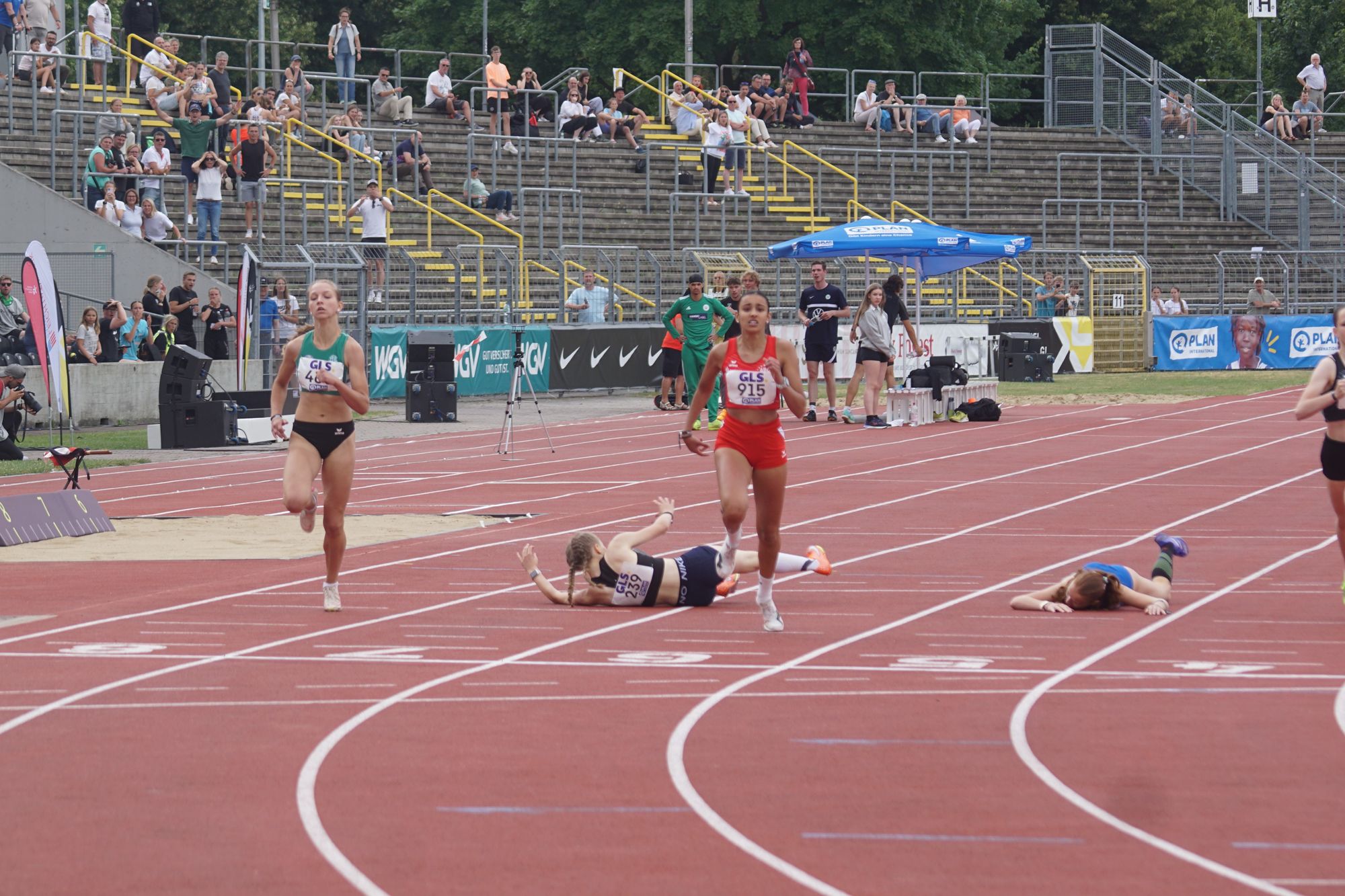 Am Sonntag war dann viel Zeit. Der erste Start war um 15:35 Uhr. Emma im Finale über 300m. Emma auf der äußeren, der achten Bahn. Der Start von Emma wie immer etwas verhalten, Emmas Stärke liegt in der zweiten Hälfte des Rennens. Kurz vor dem Ziel stürzen die Läuferinnen auf Bahn 5 und 7. Welch eine Dramatik, die Kräfte der beiden haben nicht mehr gereicht. Emma läuft eine neue persönliche Bestzeit von 41,17 Sekunden.