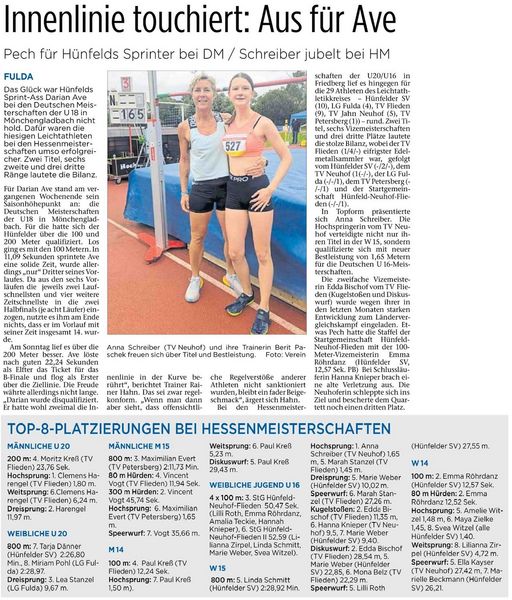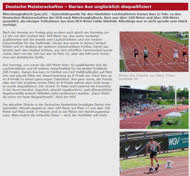 Für Darian Ave stand an diesem Wochenende sein Saisonhöhepunkt, die Deutschen Meisterschaften der U18 in Mönchengladbach auf dem Programm. Darian war über 100m und über 200m gemeldet. Gemeldet als einziger Teilnehmer aus dem HLV-Kreis Fulda-Hünfeld!