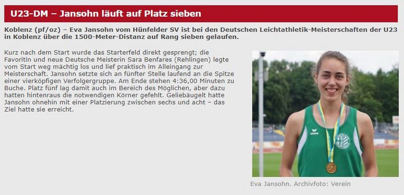 An diesem Wochenende (26../27. Juni) war das Stadion „Oberwertk“ in Koblenz Austragungsort der Deutschen U23-Meisterschaften. Unter den Teilnehmern war vom Hünfelder SV Eva Jansohn über die 1.500m Distanz am Start! Das Rennen endete Für Eva Jansohn mit einer Zeit von 4:36,00 Minuten auf Paltz „7“. Weitere Athleten aus dem HLV-Kreis Fulda-Hünfeld waren leider nicht am Start!