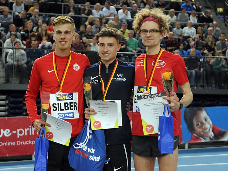 Zwei Podestplatzierungen gab es über 1.500 Meter der Männer. Marc Reuther, vor einem Jahr deutscher Hallenmeister über 800 Meter, lief im Trikot seines neuen Vereins LG Eintracht Frankfurt auf Rang zwei in 3:44,07 Minuten, Bronze sicherte sich Lukas Abele (SSC Hanau-Rodenbach) in 3:45,08 Minuten. Den Titel gewann souverän Marius Probst vom TV Wattenscheid (3:42,38).