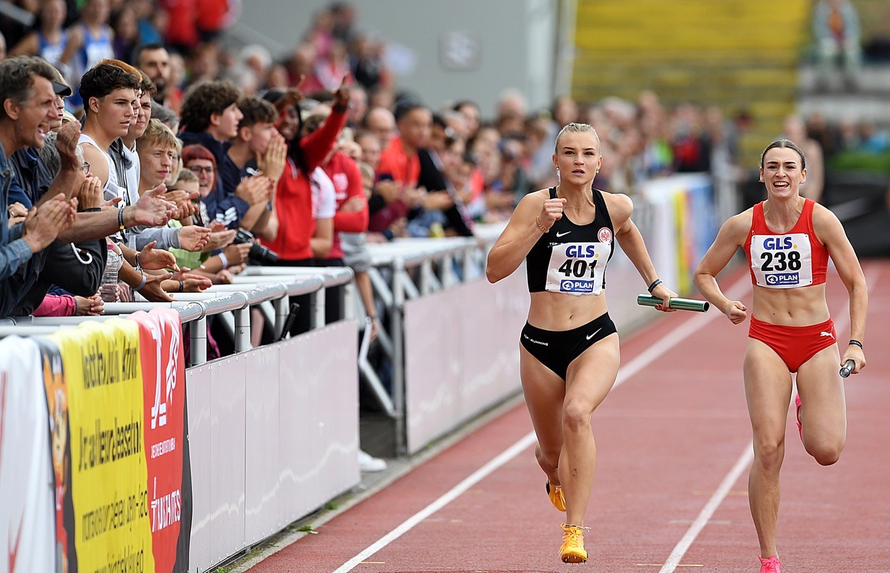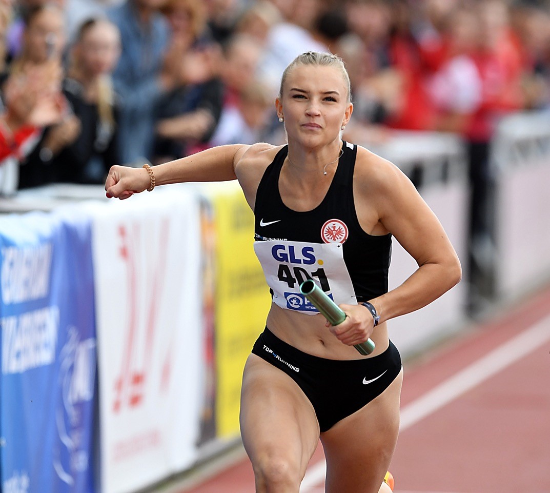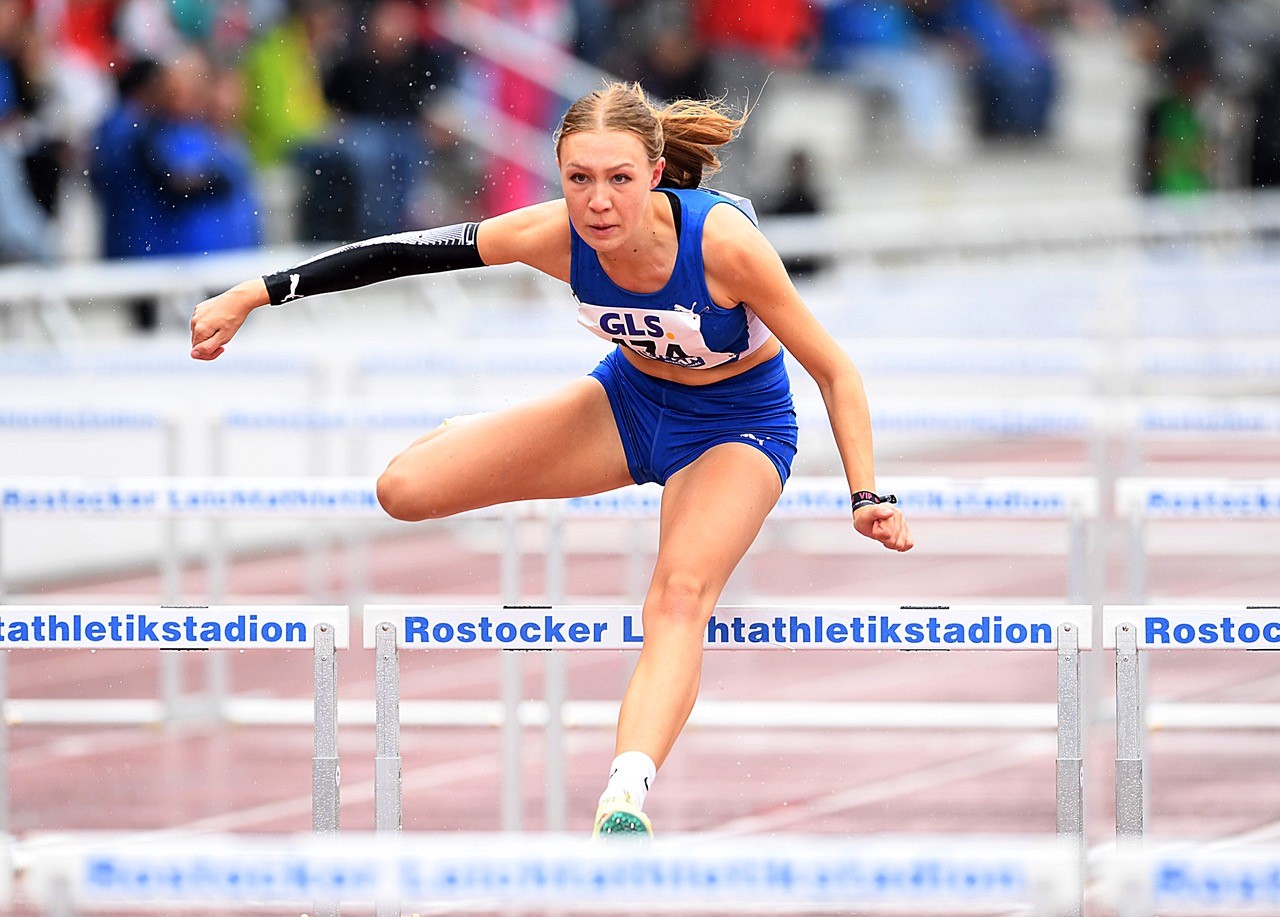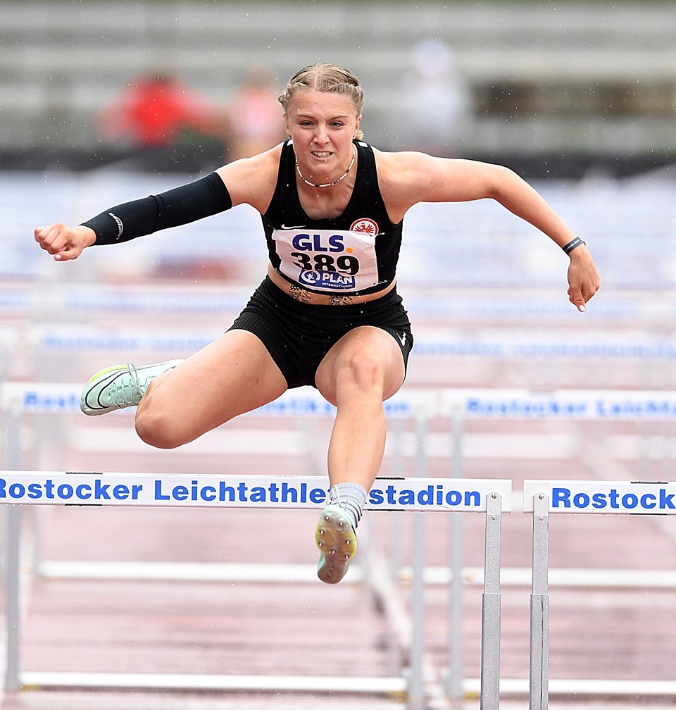 4x100 Meter: Die Eintracht-Mädels (Mia Haselhorst, Finja Köchling, Nele Kühn, Carmen Nowicka) konnte an der Ostsee ihre HM-Leistung von Bad Homburg (47,15 sec.) klar steigern und flitzten in 46,80 Sekunden als fünftschnellste Staffel über die Bahn. Der Kampf um die Bronzemedaille war eine ganz enge Angelegenheit, denn die Teams auf den Plätzen drei bis fünf trennten lediglich winzige 0,06 Sekunden. Auf die dritte Stufe des Treppchens durfte dann die Mannschaft der Startgemeinschaft Passau/Pfarrkirchen (46,74 sec.). Direkt dahinter sortierten sich das LAC Quelle Fürth (46,79 sec.) und die Frankfurterinnen ein. Den Titel holte der Hamburger SV (46,38 sec.) vor der SC DHfK Leipzig (46,76 sec.). Die Truppe des TV Groß-Gerau (Mende, Herold, Wiegand, Duvenkamp/10.) verbesserte sich leicht auf 48,02 Sekunden.