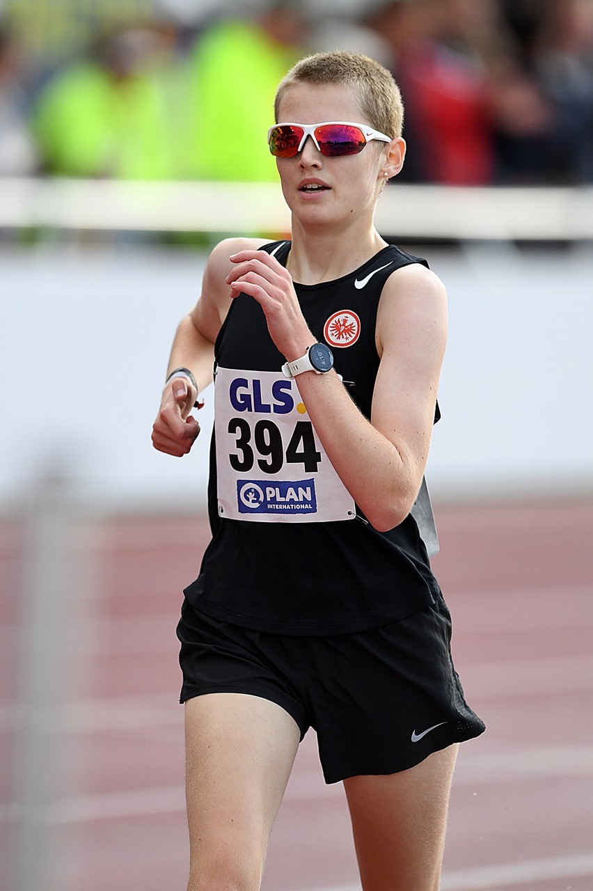 3.000 Meter Bahngehen: Hier hatte Hessen zwei Eisen im Feuer. Tabea Kiefer (Eintracht Frankfurt), mit 14:24,80 Minuten die Führende im Melderanking, ging die Sache im wahrsten Sinne des Wortes flott, aber sehr überlegt an. Im Windschatten einer kleinen Führungsgruppe, bestehend aus drei Geherinnen, hielt sie sich taktisch klug zurück. Der entscheidenden Attacke in der Endphase der siebeneinhalb Runden konnte dann keine Gegnerin folgen. Tabea konnte ihre Bestleistung um 47 Sekunden steigern und sich mit hervorragenden 13:22,13 Minuten in die Liste der Siegerinnen eintragen. Am Ende hatte Tabea einen Vorsprung von fünf Sekunden auf Ada Junghannß (Erfurter LAC, 2.). Anna-Maria Gabriel (auch Eintracht Frankfurt) blieb ebenfalls ganz sicher unter 14 Minuten und belegte mit 13:47,26 Minuten den undankbaren vierten Platz, verbesserte ihre „PB“ jedoch auch um sehr beachtliche 52 Sekunden. Dass dieser Wettkampf von einem sehr hohen Niveau geprägt war, zeigt ein Blick im Nachgang auf die Weltjahresbestenliste. Tabea Kiefer belegt mit ihrer Leistung nun den 3. Platz in der Weltjahresbestenliste der WU20, Anna-Maria Gabriel, als 4. der DM, belegt mit ihrer Zeit jedoch immer noch den 8. Platz im globalen Vergleich.