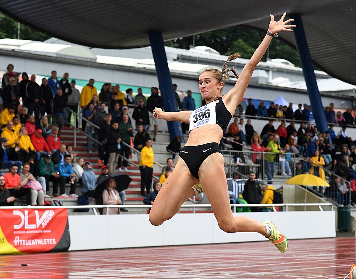 Weitsprung: Finja Köchling war Ende Mai bei der Kurpfalz-Gala in Weinheim auf 6,23 Meter geflogen. Ganz so weit ging es dann bei der DM nicht, was sicherlich auch an den schweren Rahmenbedingungen lag. Dauerregen und frische Temperaturen machte die Weitenjagd nicht zum puren Vergnügen. Im vierten Durchgang markierte Finja (windunterstützte) 6,11 Meter, was für die Bronzemedaille reichte. Als reguläre Weite konnten glatte sechs Meter im Protokoll notiert werden. Der Titel wurde mit 6,44 Metern eine Beute von Tabea Eitel (LG Filder), die ihre württembergische „Landsfrau“ Laura Raquel Müller (Unterländer LG/6,16 m) auf Distanz halten konnte. Carmen Nowicka (Eintracht Frankfurt) blieb als Zwölfte mit 5,40 Metern hinter ihren Möglichkeiten.