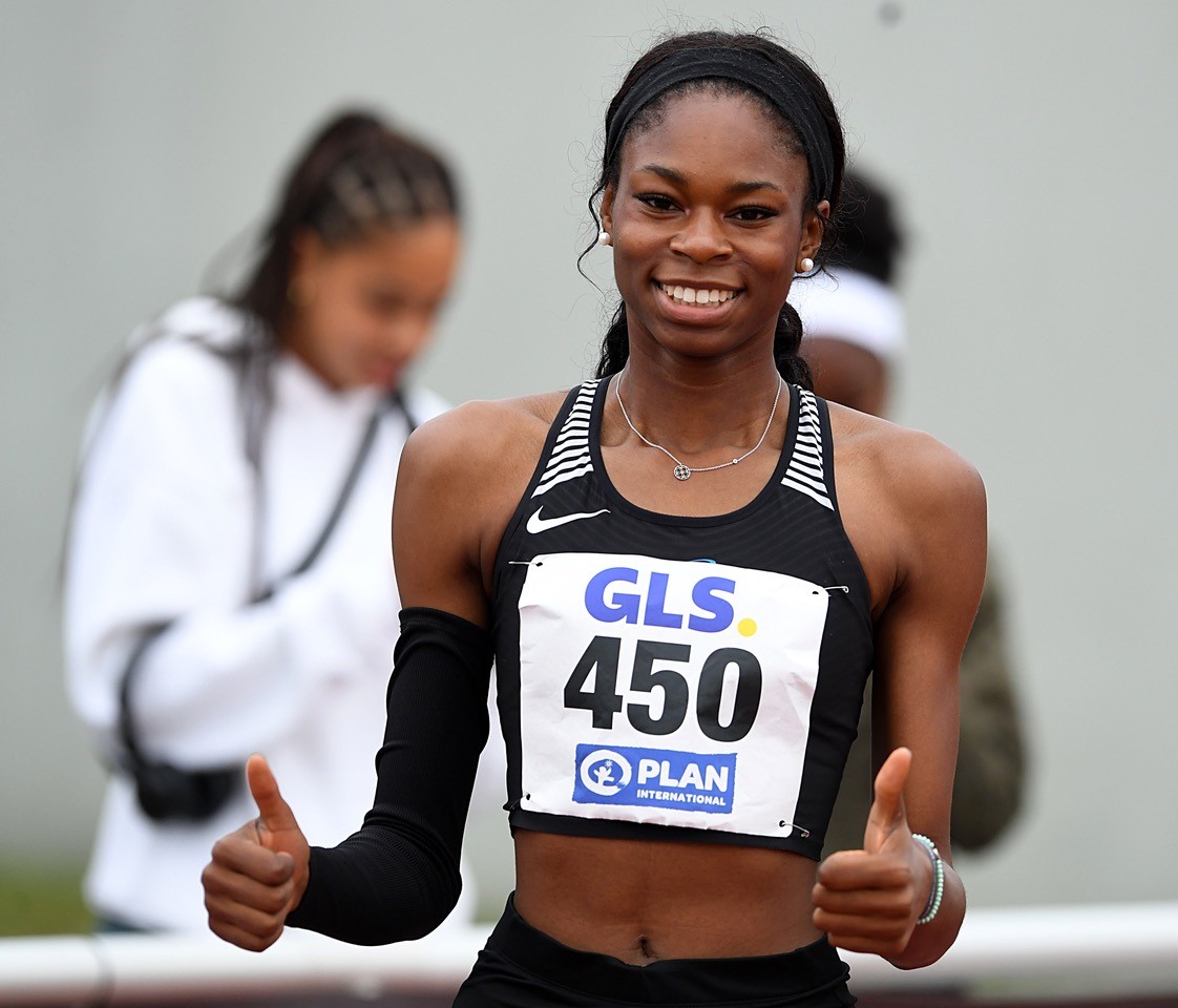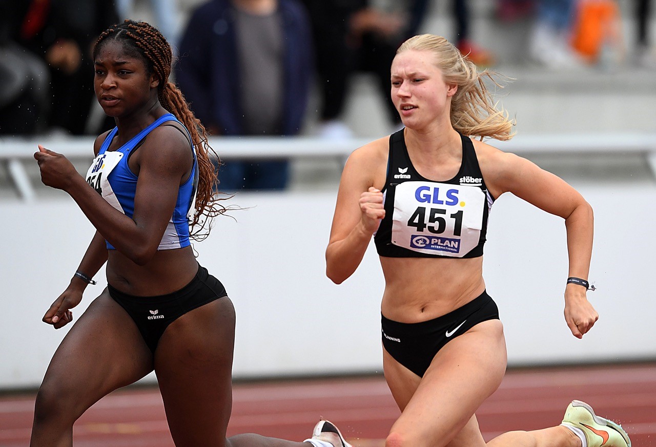 200 Meter: Zum Anfang der Saison hatte Holly Okuku (Sprintteam Wetzlar) beim Meeting ihres Vereins schon ziemlich flotte 23,82 Sekunden gezeigt. Diese Marke wurde am letzten DM-Tag dann getilgt. Und zwar gewaltig. Okuku war im Vorlauf (24,17 sec.) noch mit angezogener Handbremse unterwegs. Die wurde im Finale gelöst. Mit hervorragenden 23,56 Sekunden holte sich Holly den DM-Titel und reist in toller Form zur U20 EM nach Jerusalem. Es war aber spannend, denn Nele Jaworski (VfL Wolfsburg) machte als Zweite mit 23,66 Sekunden mächtig Druck. "Ich dachte mir: 'Holly, bleib cool! Entspannt durchziehen bis zum Schluss. Ich hatte mir fest vorgenommen, mit einer PB hier rauszugehen, und das habe ich auch geschafft. Dabei liegt mir das Wetter gar nicht so. Ich mag lieber Wärme und Sonnenschein“, verriet die überglückliche Siegerin. Die Freude war dann noch größer, als beim Rückenwind zulässige + 1,5 m/sec. angezeigt wurden.