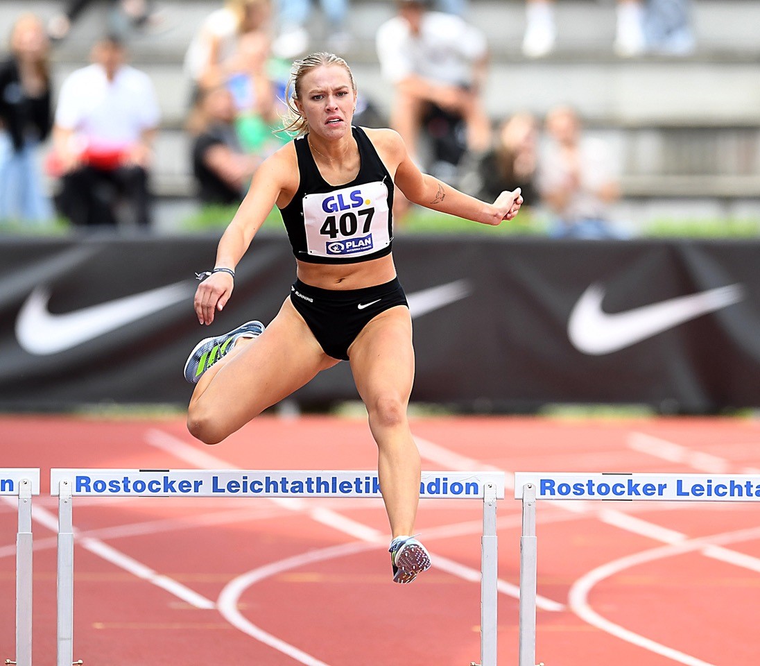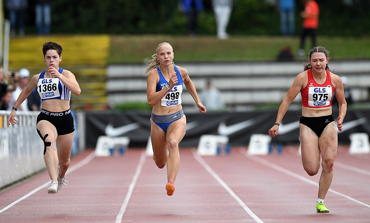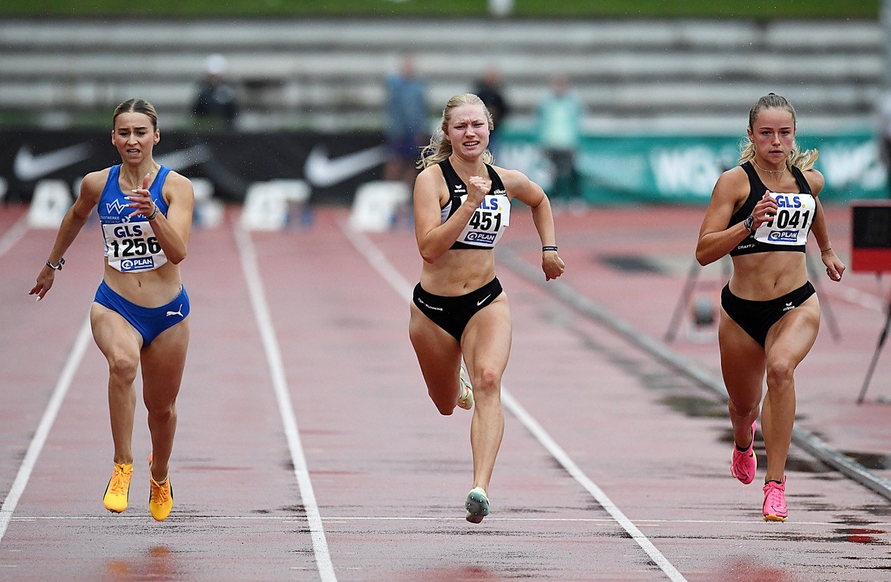 100 Meter: Das hat gepasst. Carolin Schlung (SSC Bad Sooden-Allendorf) stand bei der Anreise zur DM mit 12,04 Sekunden in der Meldeliste. Bei der Rückreise waren 11,96 Sekunden „im Gepäck“, die im Zwischenlauf erzielt wurden. Damit zog Schlung als letzte Athletin über die Zeitregel ins Finale ein. Hier zeigte die Uhren 12,01 Sekunden an, was den sechsten Platz bedeutete. Für Josephine Otto (Wiesbadener LV/bereits 11,97 sec.) endete die DM nach 12,10 Sekunden im Zwischenlauf. In der ersten Runde wurde die Sprinterin aus der Landeshauptstadt mit 12,12 Sekunden gestoppt. In der ersten Runde gingen auch noch Vivian Gruppe (MT Melsungen/12,29 sec.), Lena Sonnabend (LC Olympia Lorsch/12,34 sec.) sowie Eva Duvenkamp (TV Groß-Gerau/12,40 sec.) in den Startblock.