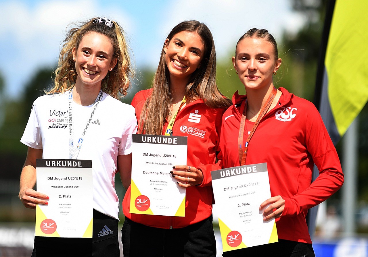 400 Meter: Vollen Einsatz bis zum letzten Meter zeigte Paula Pelzer (ASC Darmstadt) und wurde dafür mit der Bronzemedaille belohnt. Die Südhessin blieb erstmals unter 55 Sekunden und stand mit 54,99 Sekunden in der Ergebnisliste. Nur knapp hinter der ASClerin finishte Nele Kühn (Eintracht Frankfurt), die sich als Vierte auf 55,05 Sekunden steigern konnte.