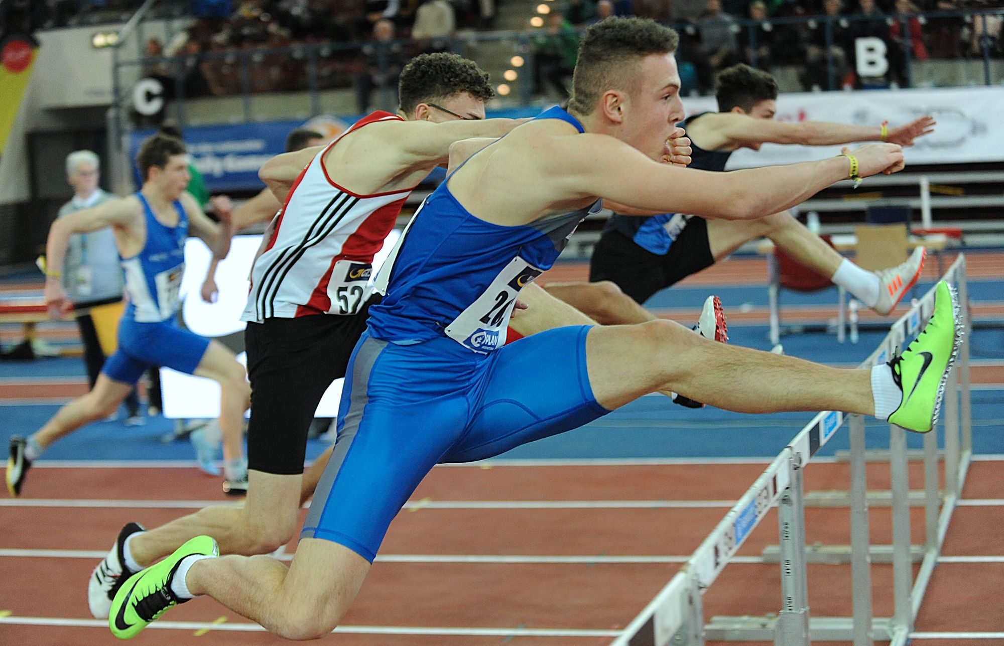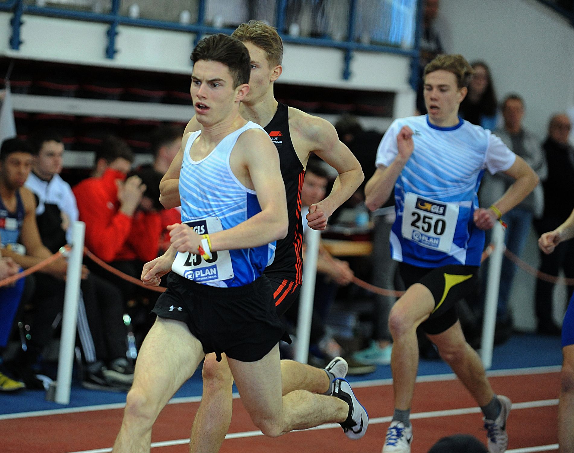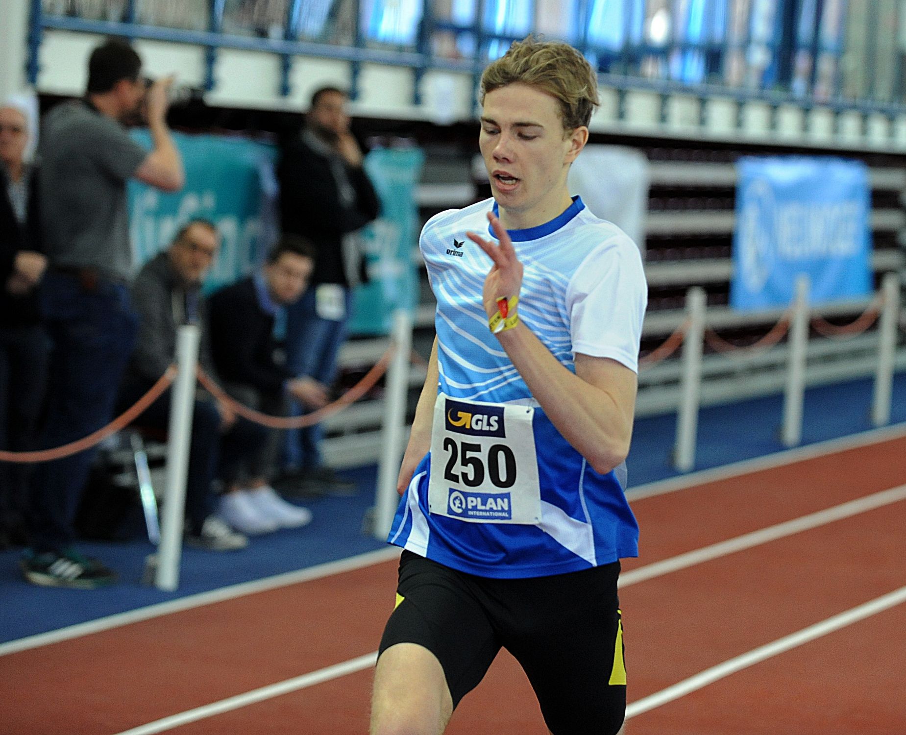 Im Weitsprung war auch noch Juan-Sebastian Kleta (TV Gelnhausen) im Einsatz, dem nach einem Satz auf 7,24 Meter (4.) lediglich sieben Zentimeter zu Bronze fehlten. Das begehrte Edelmetall holte sich Kleta über 60 Meter. Nach 6,97 Sekunden in der ersten Runde steigerte sich Juan-Sebastian im Zwischenlauf auf 6,89 Sekunden, um in Finale in 6,86 Sekunden auf den Bronzerang zu stürmen. Vereinskollege Lukas Boeddinghaus beendete seinen Vorauf über 200 Meter in 22,58 Sekunden und hatte auch noch einen Auftritt über 60 Meter Hürden (8,68 sec.). Für Moritz Mainka (Wiesbadener LV) war das Hürden-Finale Pflicht. Das klappte nach 8,04 Sekunden (VL) auch problemlos. Der Endlauf war dann eine ziemlich enge Angelegenheit, trennten hier doch lediglich 0,04 Sekunden die Athleten auf den Plätzen zwei bis fünf. Mainka war am Ende über seine 7,99 Sekunden als Fünfter enttäuscht, hatte er bei den „Hessischen“ doch schon 7,93 Sekunden abgeliefert. In den Endlauf wollte auch Aaron Giurgian laufen. Der U18er vom ASC Darmstadt (bisher 8,04 sec.) schied nach 8,15 Sekunden jedoch vorzeitig aus. Nicht weiter kam auch Mittelstreckler Okai Charles (Königsteiner LV). Der U18er entscheid sich für die 400 Meter, blieb am Start ein wenig „sitzen“. Nach 50,34 Sekunden fehlten am Ende 0,23 Sekunden fürs B-Fnale. Über 800 Meter kam Robin Pfahls (TV Gelnhausen) in den Endlauf und bestätigte hier als Siebter in 1:57,56 Minuten seine Zeit aus der ersten Runde (1:57,30 min.). Ebenfalls einen siebten Platz erlief sich in einem von Taktik geprägten 1500-Meter-Rennen Christoph Schrick (ASC Darmstadt) in 4:11,66 Minuten. Bastian Mrochen (LG Reinhardswald)konnte über 3000 Meter nach 8:46,43 Minuten als Sechster wieder durchschnaufen.