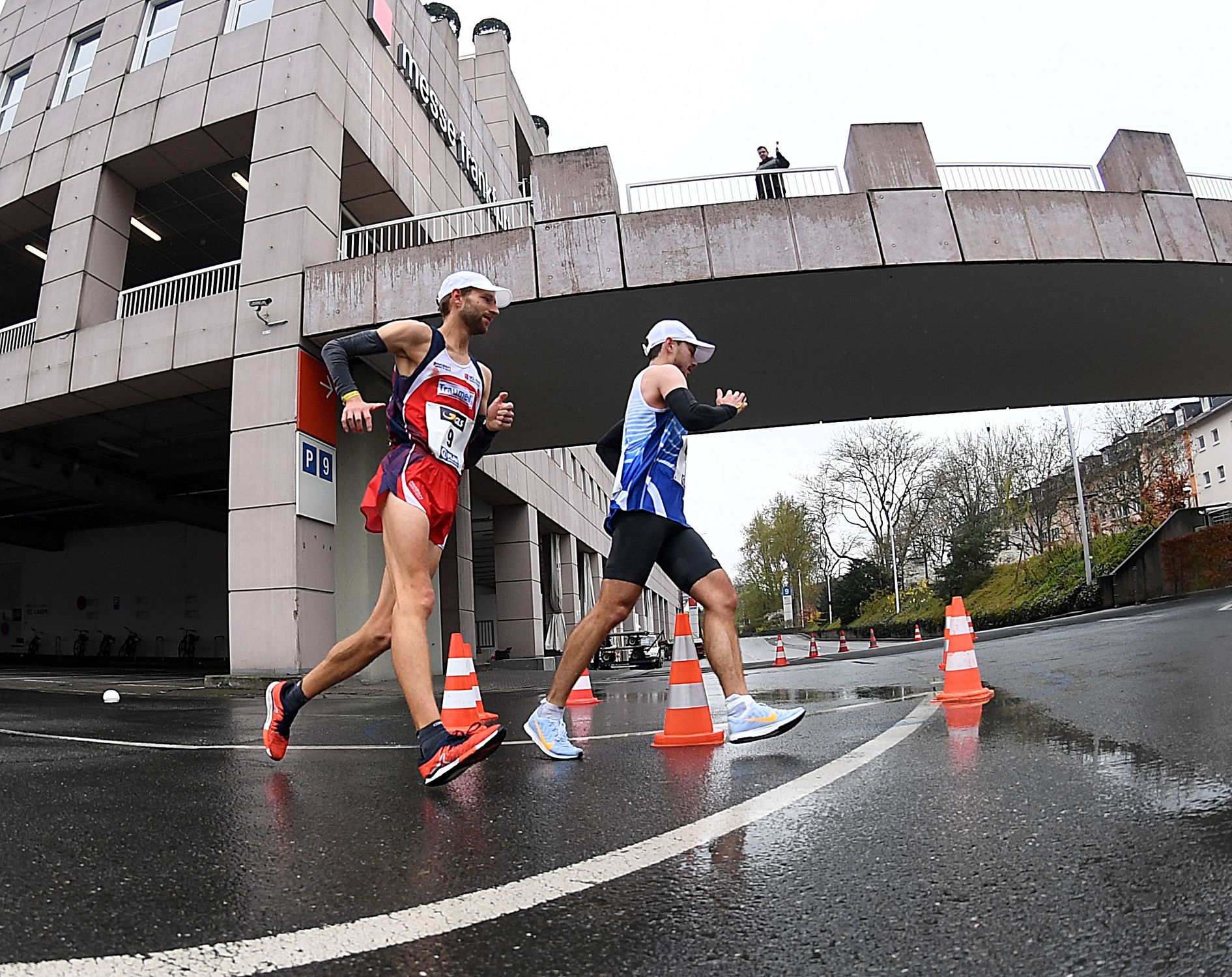 Über 20 Kilometer ließ Nils Brembach (SC Potsdam) nichts anbrennen. War hier auf den ersten Runden mit Hagen Pohle, Christopher Linke, Nils Brembach (alle Potsdam) sowie Leo Köpp (LG Nord Berlin) noch ein Quartett unterwegs, konnten sich dann Köpp und Brembach mit einer Tempoverschärfung von den Konkurrenten lösen. Auf den letzten Kilometern setzte sich der Potsdamer dann ab, sicherte sich mit 1:21:37 Stunden seinen bereits dritten DM-Titel und hakte auch den vom DLV geforderten Leistungsnachweis erfolgreich ab. Den Tokio-Richtwert (1:21:00 std.) hatte Brembach schon zuvor unterboten. Nachwuchsmann Leo Köpp (Jahrgang 1998) hatte in der neuen Bestzeit von 1:22:04 Stunden die Silbermedaille sicher, Bronze wurde mit 1:23:09 Stunden eine Beute von Christopher Linke. Der WM-Vierte von Doha ist die Norm schon gegangen, konnte in Frankfurt wegen Magenproblemen jedoch nicht sein volles Leistungspotential abrufen.