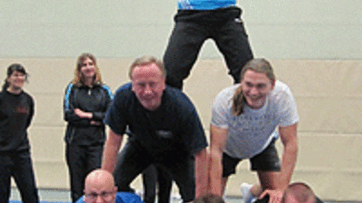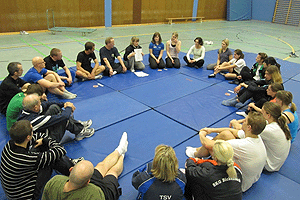 In der zweitägigen Ausbildungsveranstaltung des Hessischen Leichtathletik-Verbandes (HLV) haben die beiden Referenten Yvonne Ripper und Dominic Ullrich (DLV Projektgruppe „Kinder in der Leicht-athletik“) es sich zur Aufgabe gemacht, Trainern, Übungsleitern und solchen die es werden wollen, Bewegungsangebote aufzuzeigen, um so Kindern mit Leichtathletik eine attraktive Freizeitbeschäfti-gung an zu bieten. Ein gesundes Maß an Theorie und Praxis, in der man alle Übungen und Spiele auch selbst ausprobieren konnte, brachte es auf einen Nenner: Mit einfachen Materialien aus dem Alltag wie z.B. Wäscheklammern, Joghurtbechern oder Fahrradrei-fen, welche jeder zu Hause hat oder günstig erwerben kann, zeigten das eingespielte Referententeam Bewegungsmöglichkeiten sowie Übungsvariationen und wie diese Ideen in das Leichtathletiktraining im Verein eingebracht werden können. „Ich war wirklich überrascht, was alles möglich ist und wie man mit wenigen Handgriffen eine völlig neuen Blickpunkt der Übung erzeugt.“, kommentierte Sophie Jehle als zufriedene Teilnehmerin. Wie kann man als Trainer seine Kindergruppe motivieren und wie kann man sich in sie hineinverset-zen? Dies waren u.a. wichtige Fragestellungen der Veranstaltung. In diesem Kurs ist klar geworden, dass es die Aufgabe der Trainer ist, Kindern grundlegende Bewegungserfahrungen in den Bewe-gungsbereichen Laufen, Springen, Werfen, Turnen und Spielen zu vermitteln. Um das eben genannte umzusetzen lernten die Teilnehmer dieser Ausbildungsveranstaltung, wie Trainingsstunden vorbereitet und (auch zeitlich) möglichst optimal umgesetzt werden können. Dafür wurden in Kleingruppen Trai-ningsstunden konkret geplant und im Anschluss den anderen Gruppenteilnehmern zur Diskussion präsentiert. Durch diesen Austausch war es möglich eigene positive sowie auch negative Erfahrungen mit z.B. Aufwärmspielen oder Übungen einzubringen, um so von den Erfahrungen der anderen Teil-nehmer zu lernen.
