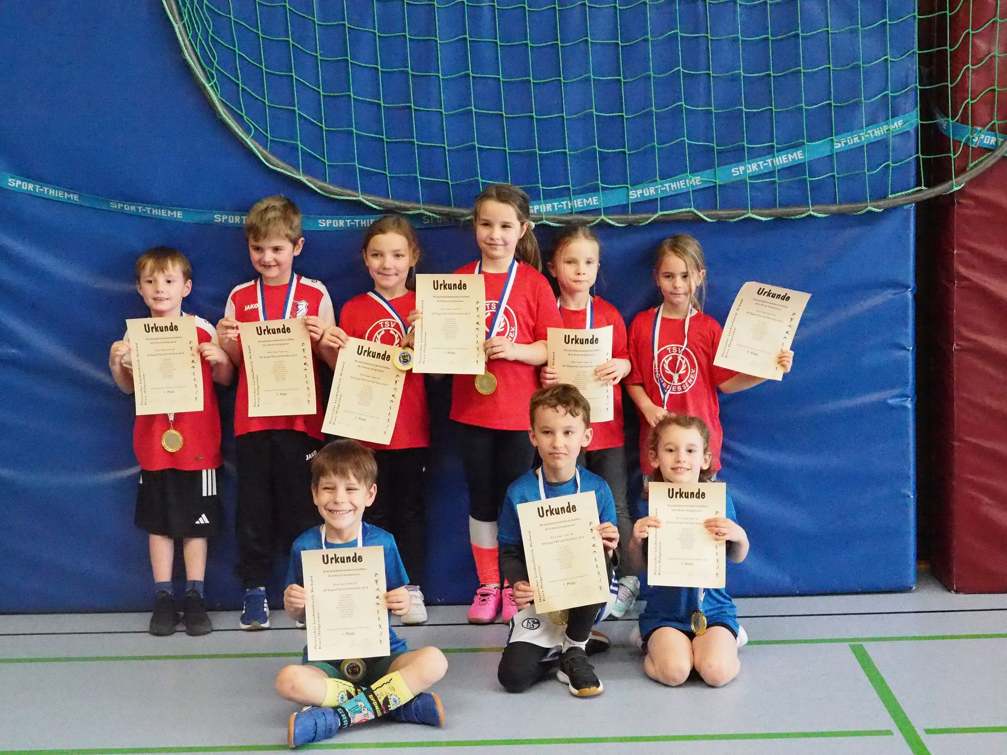 Wolfhagen Bei den Kreishallenmeisterschaften im Kinderleichtathletik-Teamwettkampf setzten sich in der Altersklasse U8 Mara Sophie Drönner, Theo Barthel, Enzo Braunhahn (alle SV Espenau), Leonard Böhm, Henry Wagner, John Böhm (alle TSV Udenhausen), Reese Zeller, Hanna Brümmer, Patricia Tölle und Antonia Hönsch (alle Hom) in einem spannenden Zweikampf gegen die Titelverteidiger vom VfL Wolfhagen mit Till Lüdicke, Marie Hofmann, Sophie Hofmann, Frida Wiegand, Anna-Victoria Döhne, Greta Matejcek, Nicolas Tönges, Maila Wagner, Amelia Löber, Samuel Kul und Emilia Liersch durch. Nach Hindernisstaffel, Einbeinhüpfer-Staffel und Medizinballstoß hatten beide Teams mit fünf Wertungspunkten gleichauf gelegen. Im abschließenden Teambiathlon trumpften dann aber die Talente aus Udenhausen, Espenau und Hombressen mit der Topzeit von 2:26,4 Minuten auf, während Wolfhagen in 3:01,9 Minuten nur auf Rang vier landet. Neben dem Biathlon ging auch die Disziplinwertung im Medizinballstoß mit 129 Weitenpunkten an Espenau/Udenhausen/Hombressen. In der Einzelwertung im Medizinballstoß erzielten Jule Wiegand (VfL Wolfhagen, 32), Leonard Böhm (25) und Ayden Losem (24, MTV Vernawahlshausen) in der Addition der drei besten aus vier Stößen die größten Weiten.