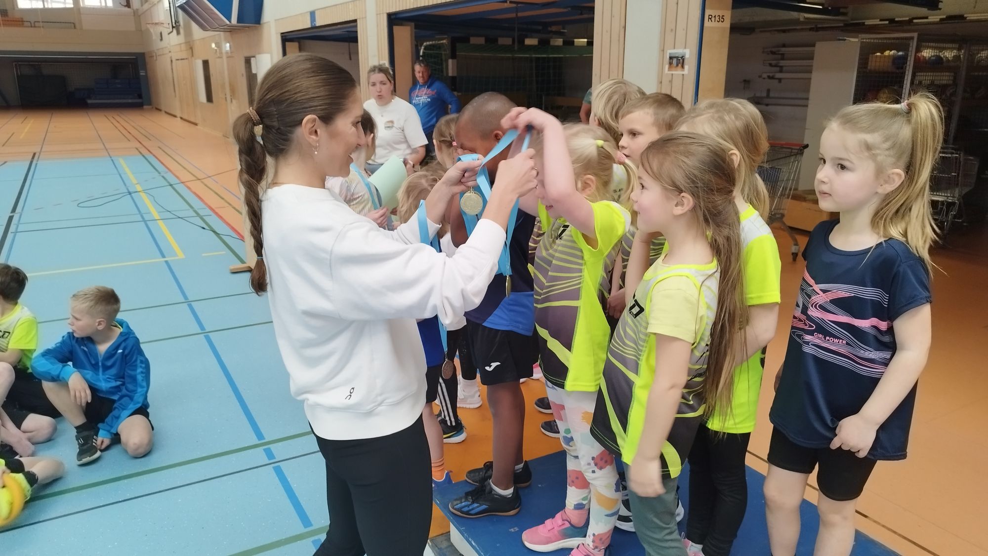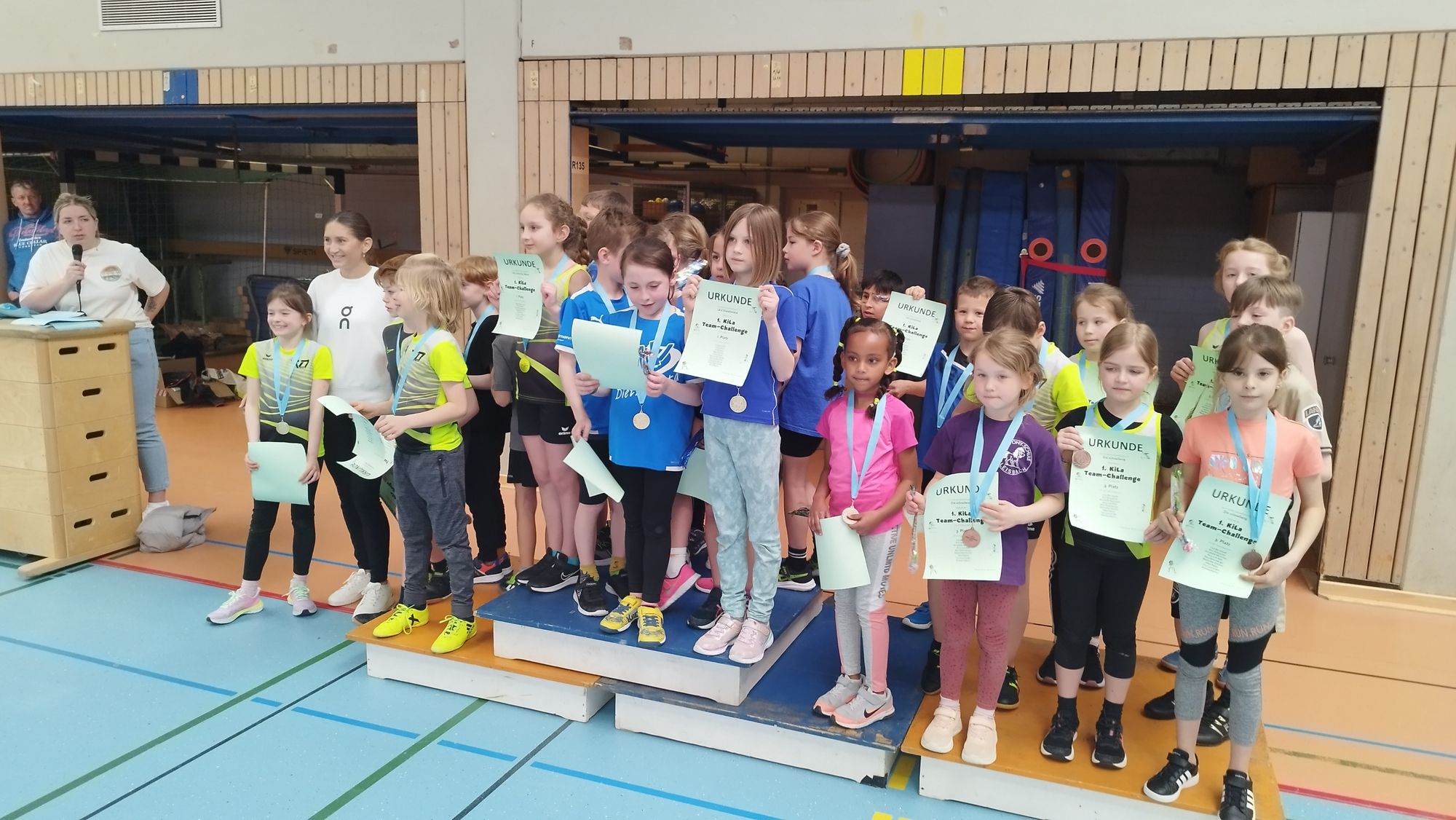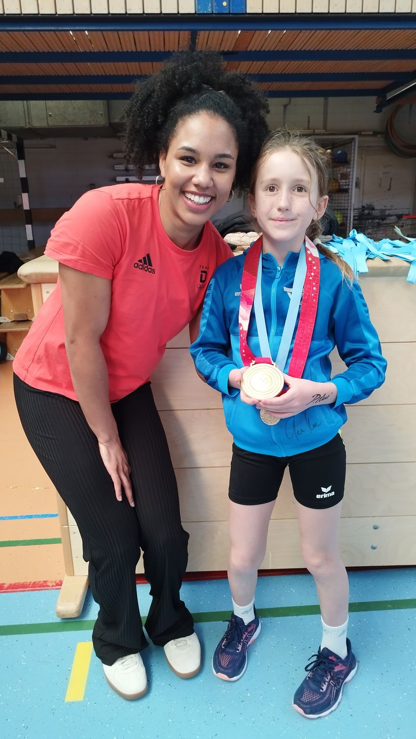 Ein besonderes Highlight des Halbjahres war die 1. Kila-Challenge, die am 22. März in der Nassau-Oranien-Halle Dillenburg stattfand. 67 Kinder aus verschiedenen Teams der Altersklassen U8, U10 und U12 traten hier an. Mit dabei für den TV Dillenburg waren auch Kinder, die an der AG teilgenommen haben. Die Teilnehmenden erkämpften sich zahlreiche Medaillen, Pokale und Urkunden. Für die jüngeren Geschwister wurde ein abwechslungsreiches Bewegungsangebot an Mitmachstationen organisiert, darunter Dosenwerfen, Standweitsprung und ein Hüpfparcours. Besonders motivierend war der Besuch der erfolgreichen Profisportlerinnen Gesa Krause und Deborah Levi - beide haben zu Ihrer Kinder- und Jugendzeit die leichtathletische Grundausbildung im TV Dillenburg erhalten. Sie führten die Siegerehrungen durch und standen allen Kindern für Fragen und Autogramme zur Verfügung. Dieses Event war nicht nur ein Höhepunkt für die Kinderleichtathletik- Kooperation, sondern auch eine wertvolle Erfahrung für alle Beteiligten.