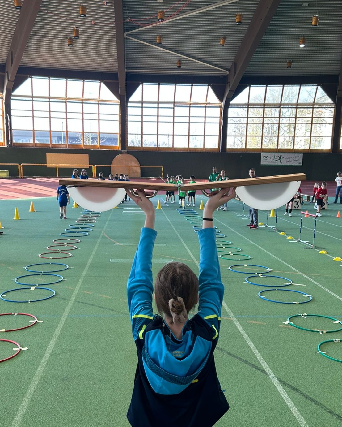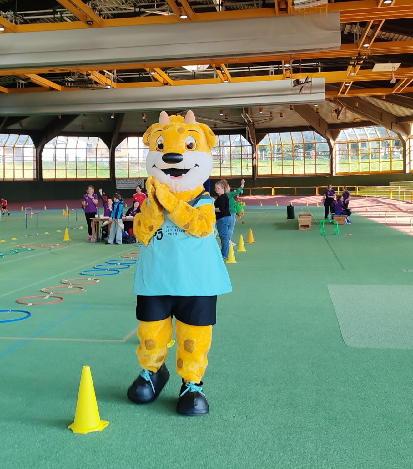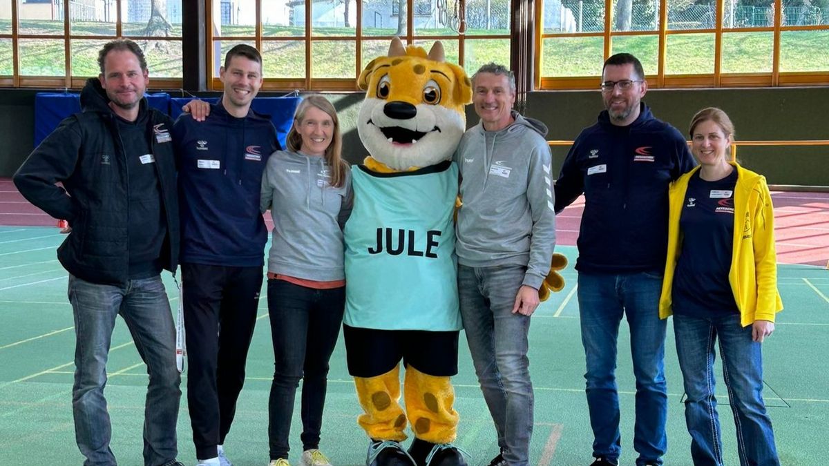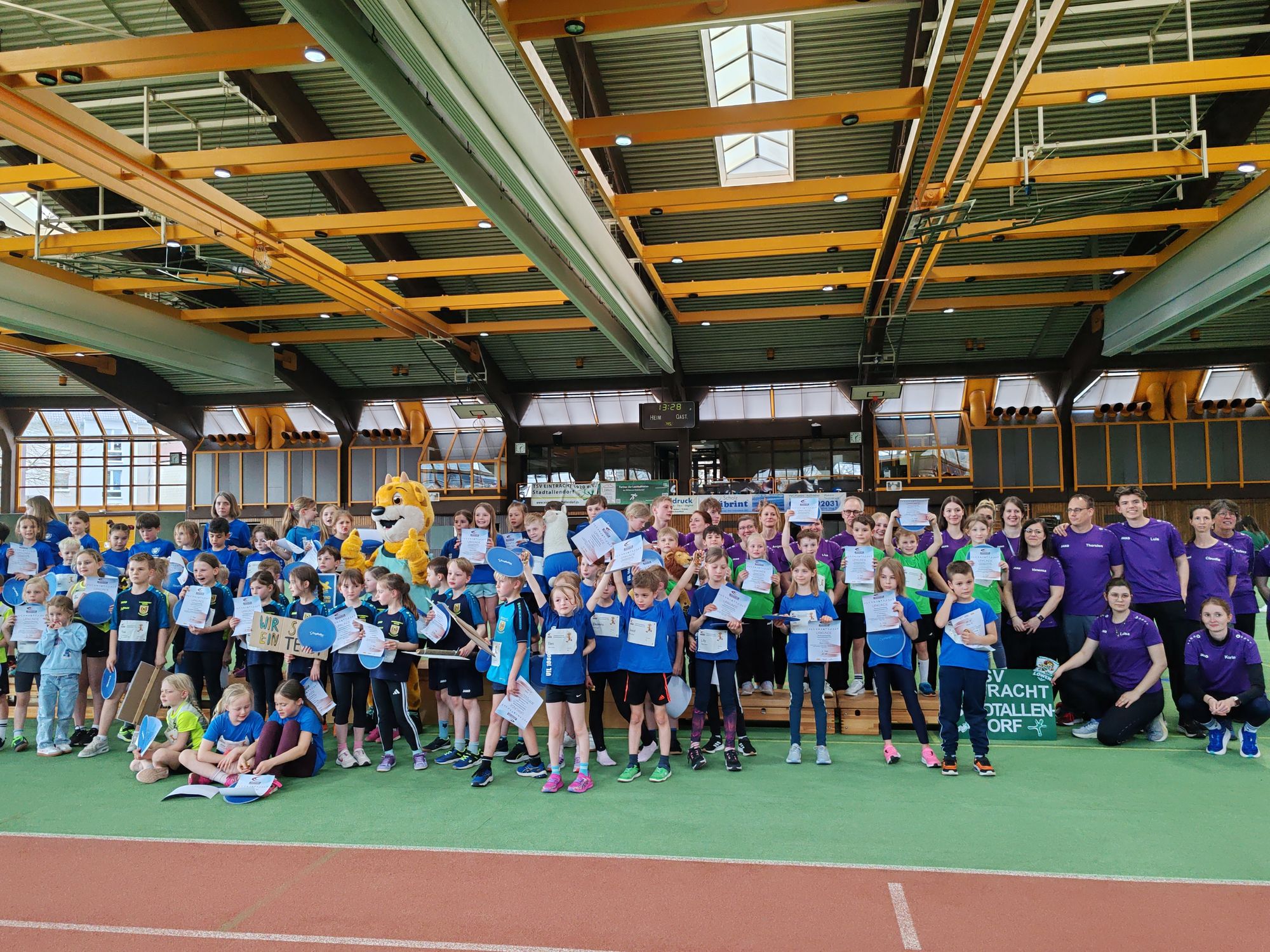 Direkt am Sonntag folgte die Prüfung der C-Trainer-Kinderleichtathletik-Ausbildung in Stadtallendorf. Als Abschlussprüfung organisierte die Ausbildungsgruppe einen U10-Wettbewerb mit zehn Teams. Die 30 lilafarbenen T-Shirts der Teilnehmenden waren beim Aufbau in der Halle deutlich zu erkennen. Auch für das leibliche Wohl war bestens gesorgt: Ein vielfältiger Kuchentisch wurde von allen Teilnehmenden begeistert angenommen. Der Erlös daraus wurde bereits zu gleichen Teilen an Skate Aid, den Elternverein krebskranker Kinder Gießen und Freunde der Leichtathletik gespendet. Schon von Beginn an sorgten der Einmarsch der Teams, das Mitjubeln des DLV-Maskottchens „Jule“ und die begleitende Musik für eine großartige Stimmung. Die ausgewählten Disziplinen umfassten einen 40-m-Sprint, eine 30-m-Hindernis-Sprintstaffel, Wechselsprünge, Medizinballstoßen und einen Transportlauf. Der Tag bildete den Abschluss von vier intensiven Monaten mit einem Onlinekurs sowie sechs Präsenzwochenenden. Dabei ging es nicht nur darum, Spiele kennenzulernen, sondern vor allem die Bewegungsfelder und Disziplinen der Leichtathletik praxisnah zu vermitteln und die Teilnehmenden einfühlsam an die Arbeit mit Kindern heranzuführen.