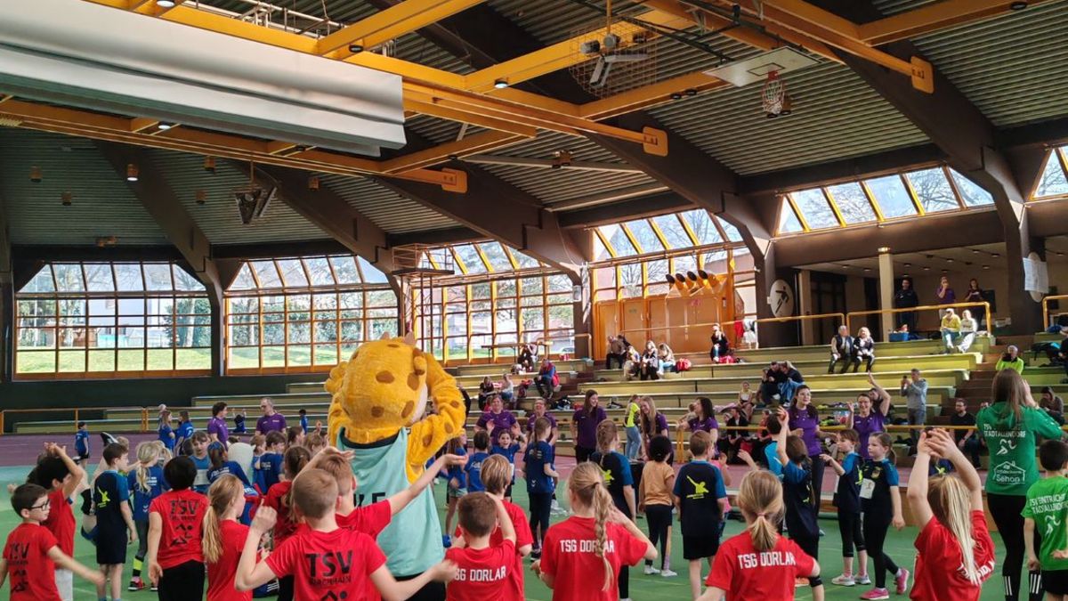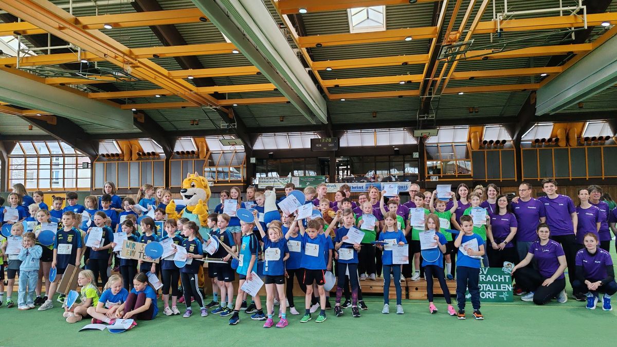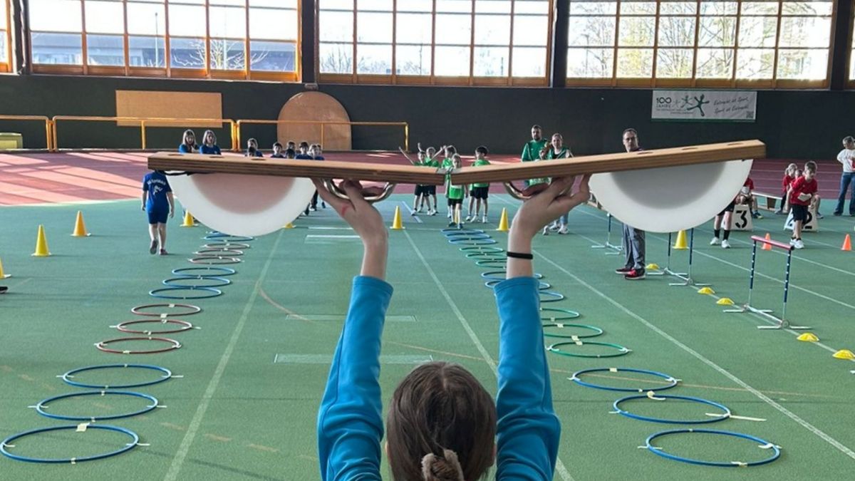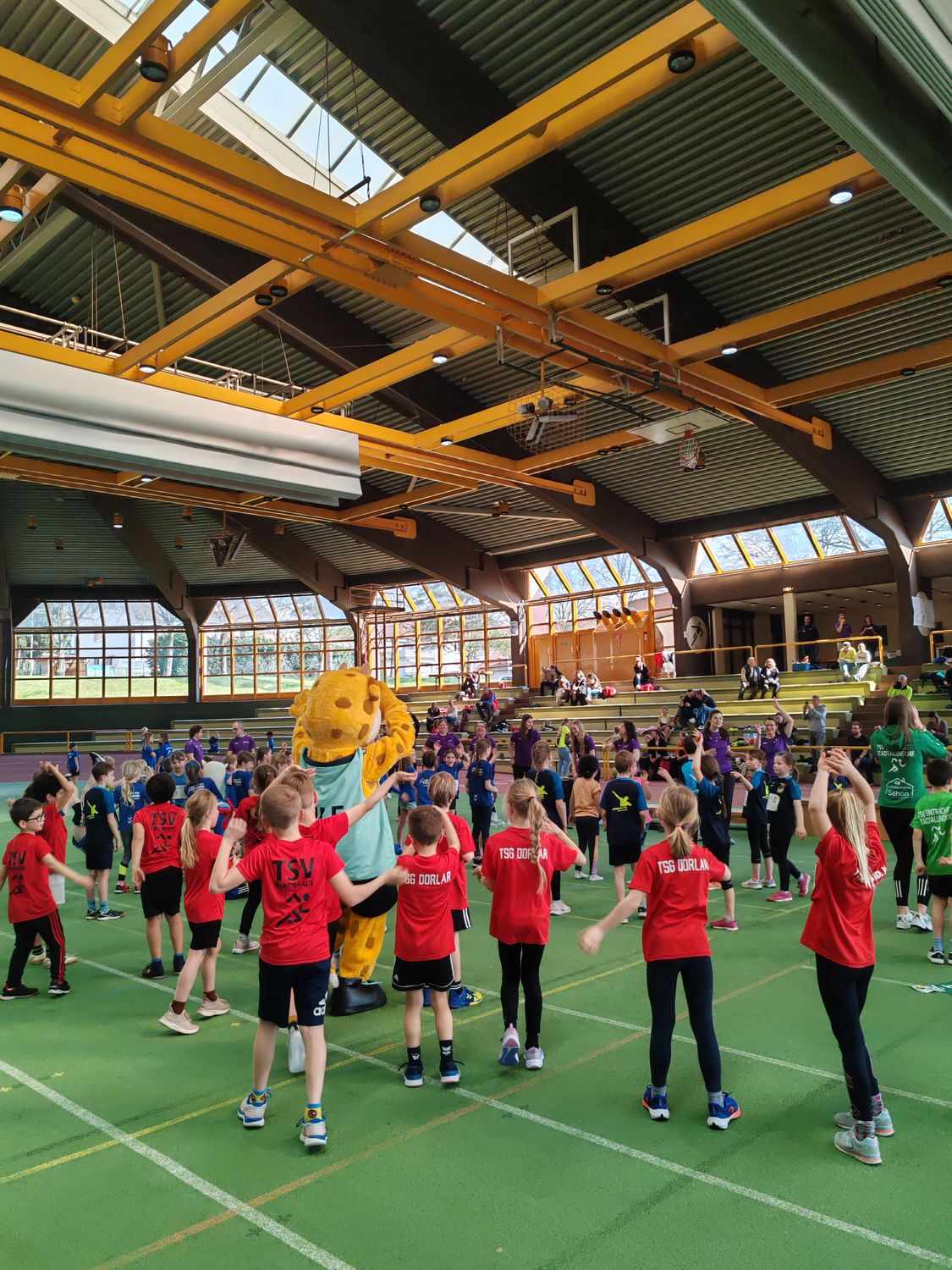 Direkt am Sonntag folgte die Prüfung der C-Trainer-Kinderleichtathletik-Ausbildung in Stadtallendorf. Als Abschlussprüfung organisierte die Ausbildungsgruppe einen U10-Wettbewerb mit zehn Teams. Die 30 lilafarbenen T-Shirts der Teilnehmenden waren beim Aufbau in der Halle deutlich zu erkennen. Auch für das leibliche Wohl war bestens gesorgt: Ein vielfältiger Kuchentisch wurde von allen Teilnehmenden begeistert angenommen. Der Erlös daraus wurde bereits zu gleichen Teilen an Skate Aid, den Elternverein krebskranker Kinder Gießen und Freunde der Leichtathletik gespendet. Schon von Beginn an sorgten der Einmarsch der Teams, das Mitjubeln des DLV-Maskottchens „Jule“ und die begleitende Musik für eine großartige Stimmung. Die ausgewählten Disziplinen umfassten einen 40-m-Sprint, eine 30-m-Hindernis-Sprintstaffel, Wechselsprünge, Medizinballstoßen und einen Transportlauf. Der Tag bildete den Abschluss von vier intensiven Monaten mit einem Onlinekurs sowie sechs Präsenzwochenenden. Dabei ging es nicht nur darum, Spiele kennenzulernen, sondern vor allem die Bewegungsfelder und Disziplinen der Leichtathletik praxisnah zu vermitteln und die Teilnehmenden einfühlsam an die Arbeit mit Kindern heranzuführen.