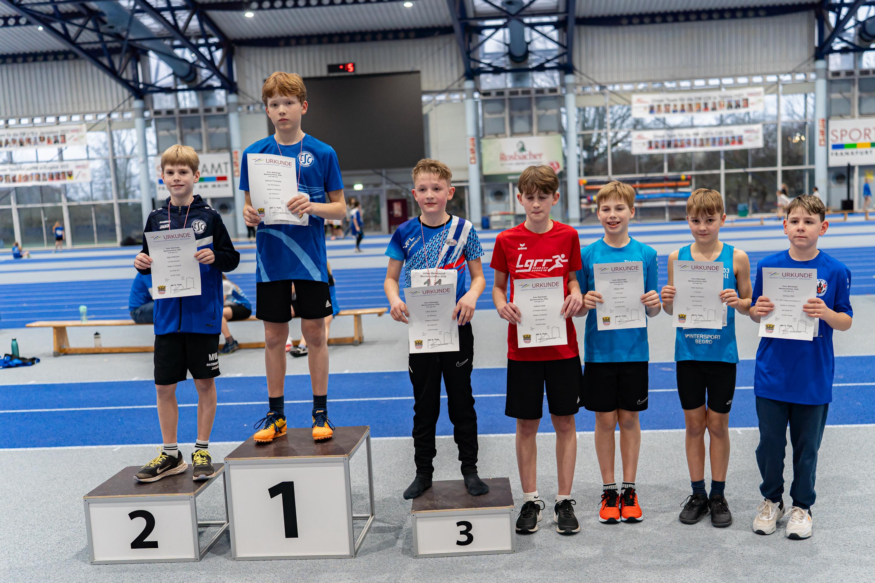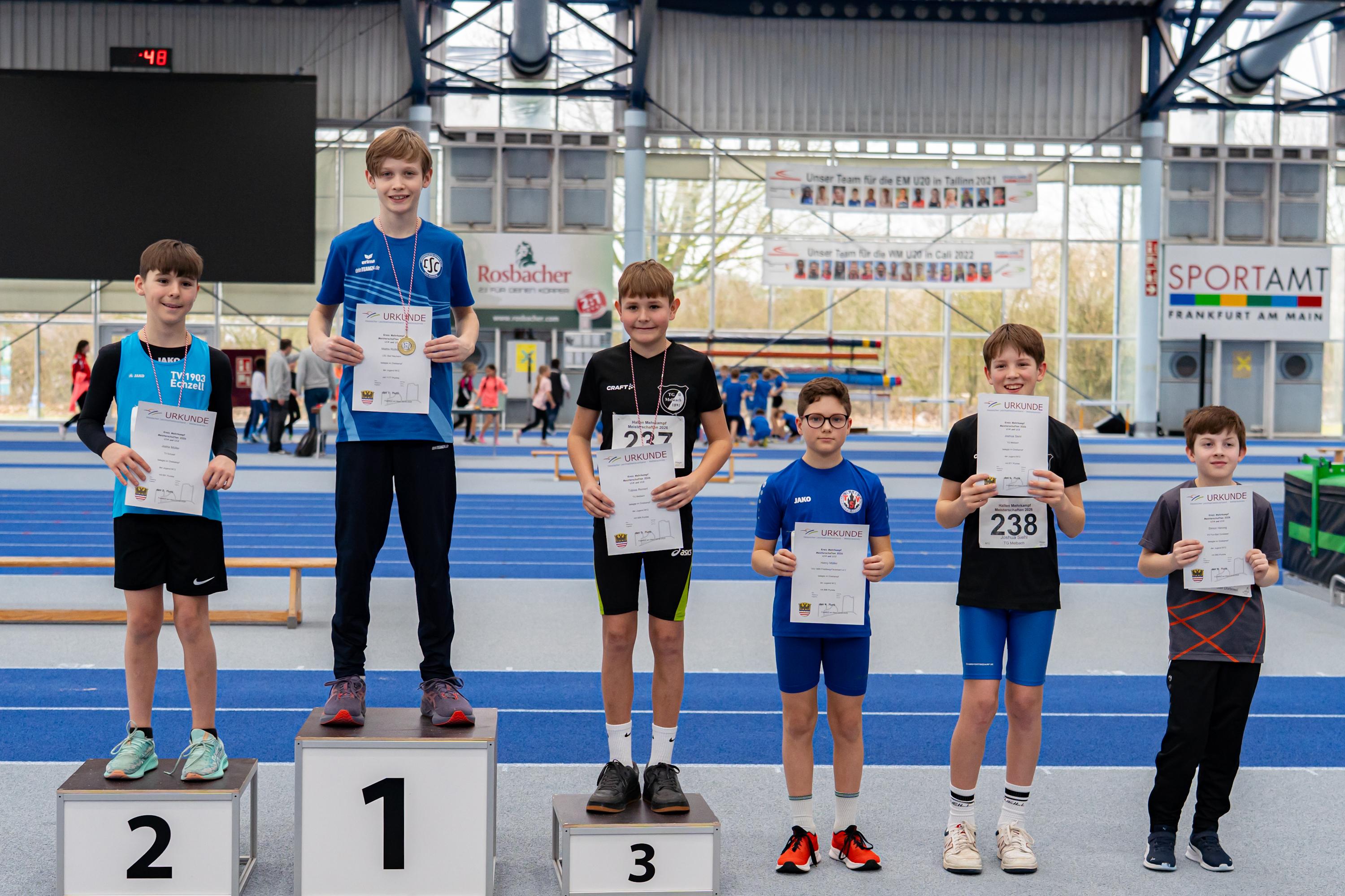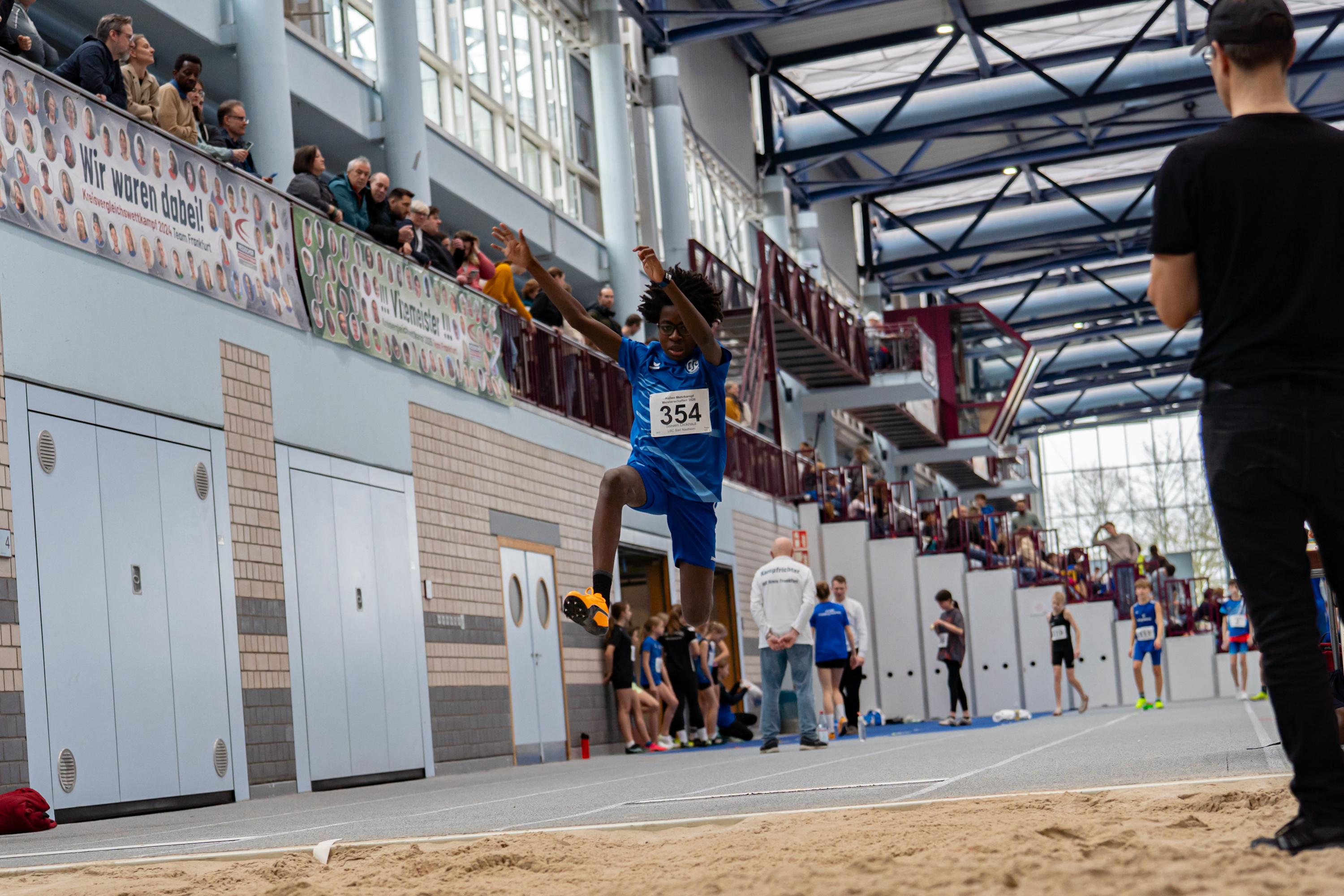 Bei der Meisterschaft, die gemeinsam mit dem Main- und dem Hochtaunuskreis ausgetragen wurde und ein Rekordmeldeergebnis von über 400 Teilnehmerinnen und Teilnehmer verzeichnete, setzte sich Sarah Pompetzki in der W13 gegen alle Konkurrentinnen durch. 4,48 Meter im Weitsprung waren die Tagesbestweite, zudem lief sie 8,81 Sekunden über 60 Meter und stieß die Kugel auf 7,32 Meter. Jordan sprang unter anderem 1,44 Meter hoch – Tageshöchstwert über alle Altersklassen hinweg. Dies gelang M13-Dreikampfsieger Steven Dickhaut über 60 Meter in 8,47 Sekunden und mit 4,96 Meter im Weitsprung.