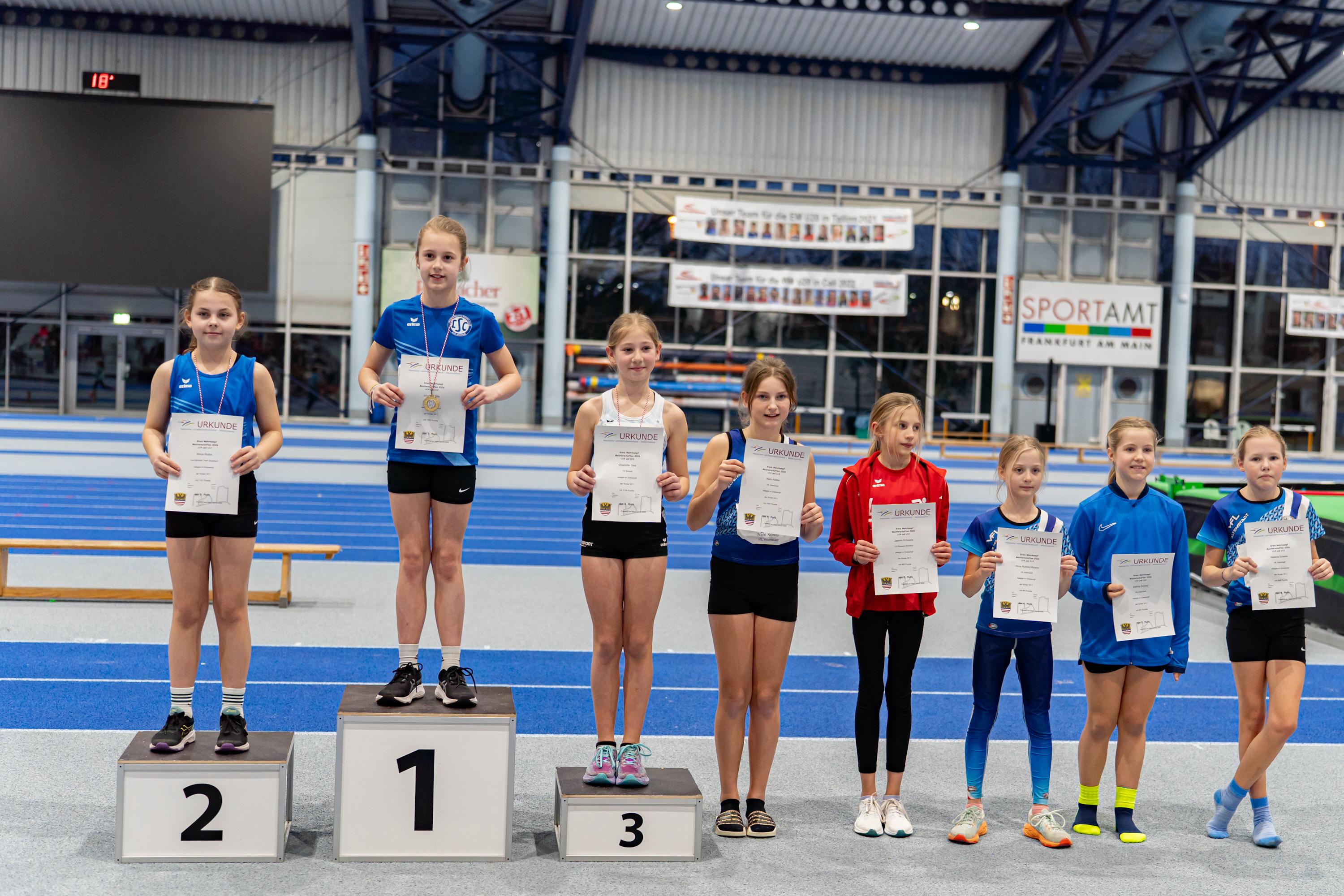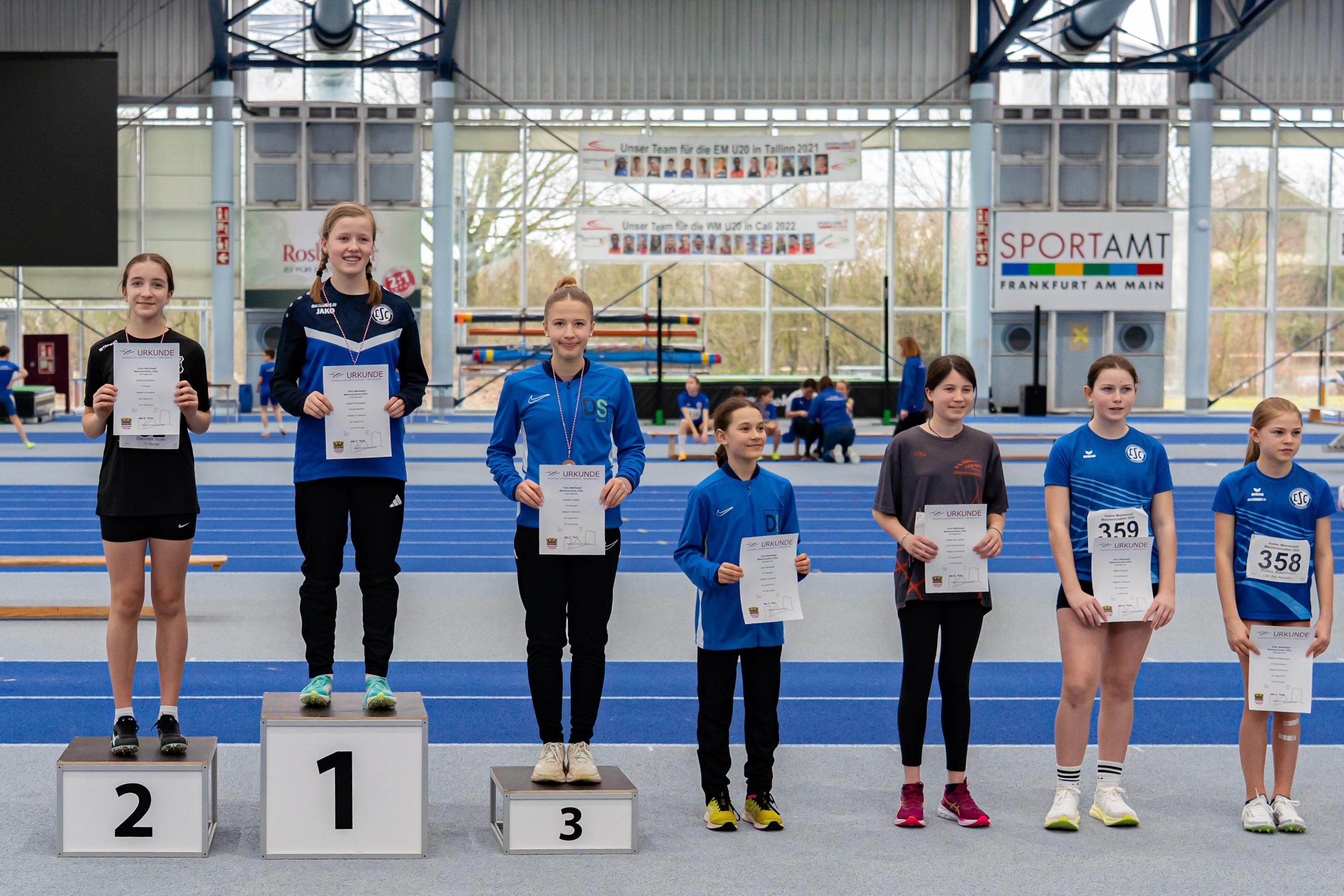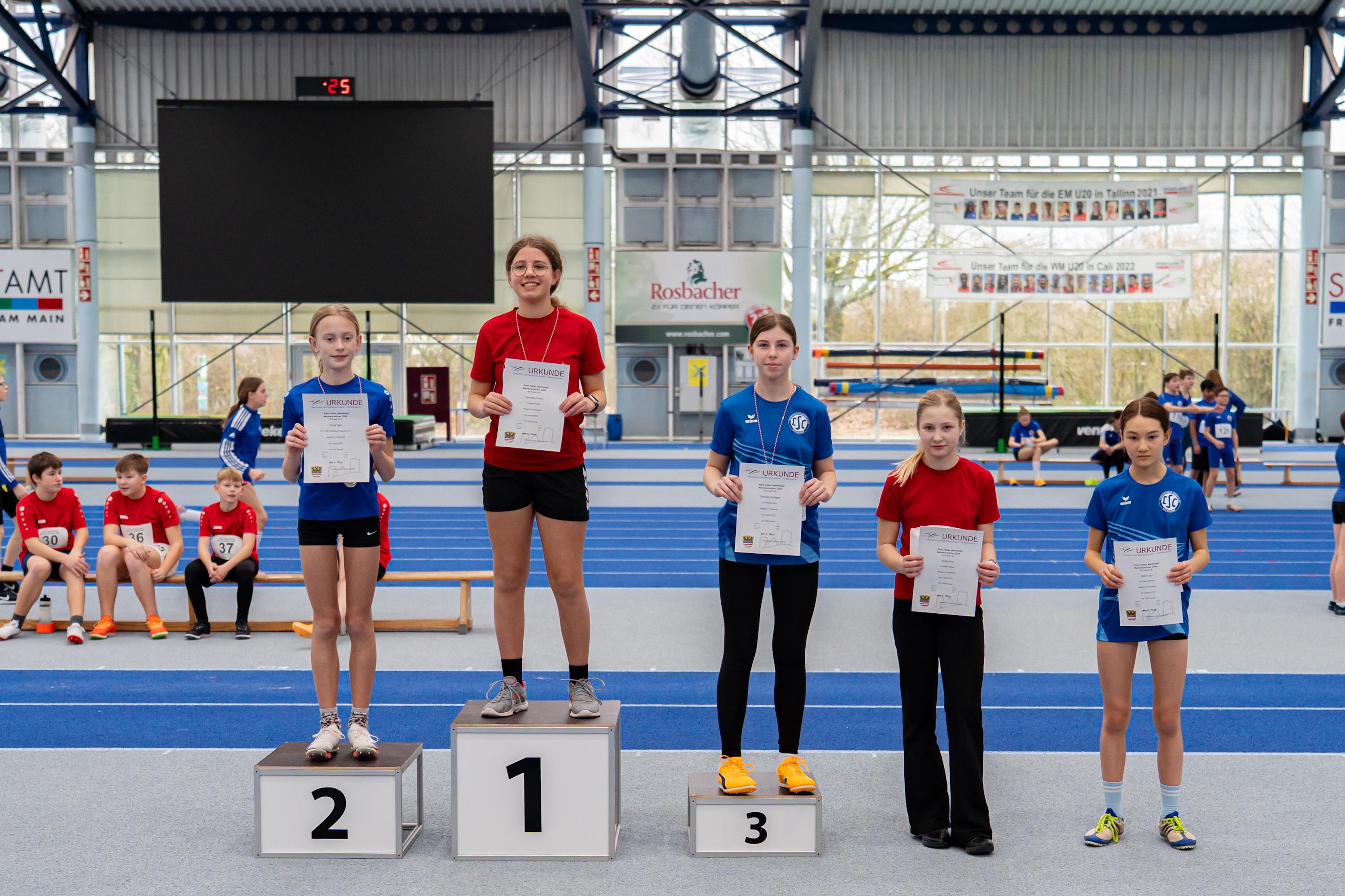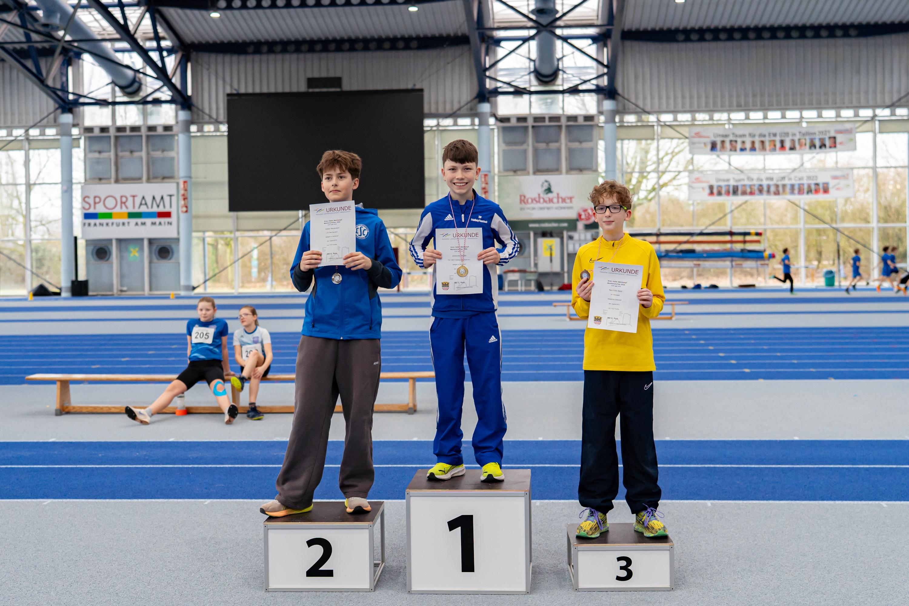 Bei der Meisterschaft, die gemeinsam mit dem Main- und dem Hochtaunuskreis ausgetragen wurde und ein Rekordmeldeergebnis von über 400 Teilnehmerinnen und Teilnehmer verzeichnete, setzte sich Sarah Pompetzki in der W13 gegen alle Konkurrentinnen durch. 4,48 Meter im Weitsprung waren die Tagesbestweite, zudem lief sie 8,81 Sekunden über 60 Meter und stieß die Kugel auf 7,32 Meter. Jordan sprang unter anderem 1,44 Meter hoch – Tageshöchstwert über alle Altersklassen hinweg. Dies gelang M13-Dreikampfsieger Steven Dickhaut über 60 Meter in 8,47 Sekunden und mit 4,96 Meter im Weitsprung.